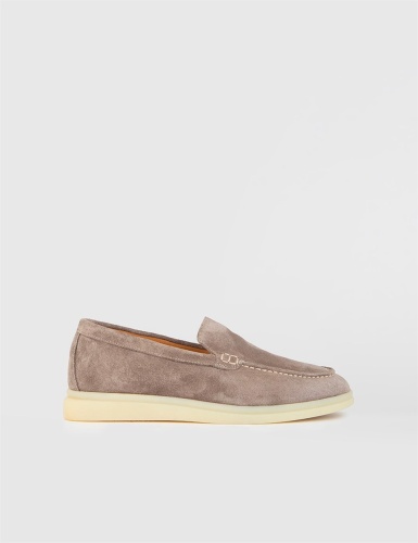Серо-бежевые замшевые кожаные женские лоферы. Изготовлено из высококачественной телячьей кожи. Bысота подошвы: 2 см. Резиновая подошва. Ручная работа.