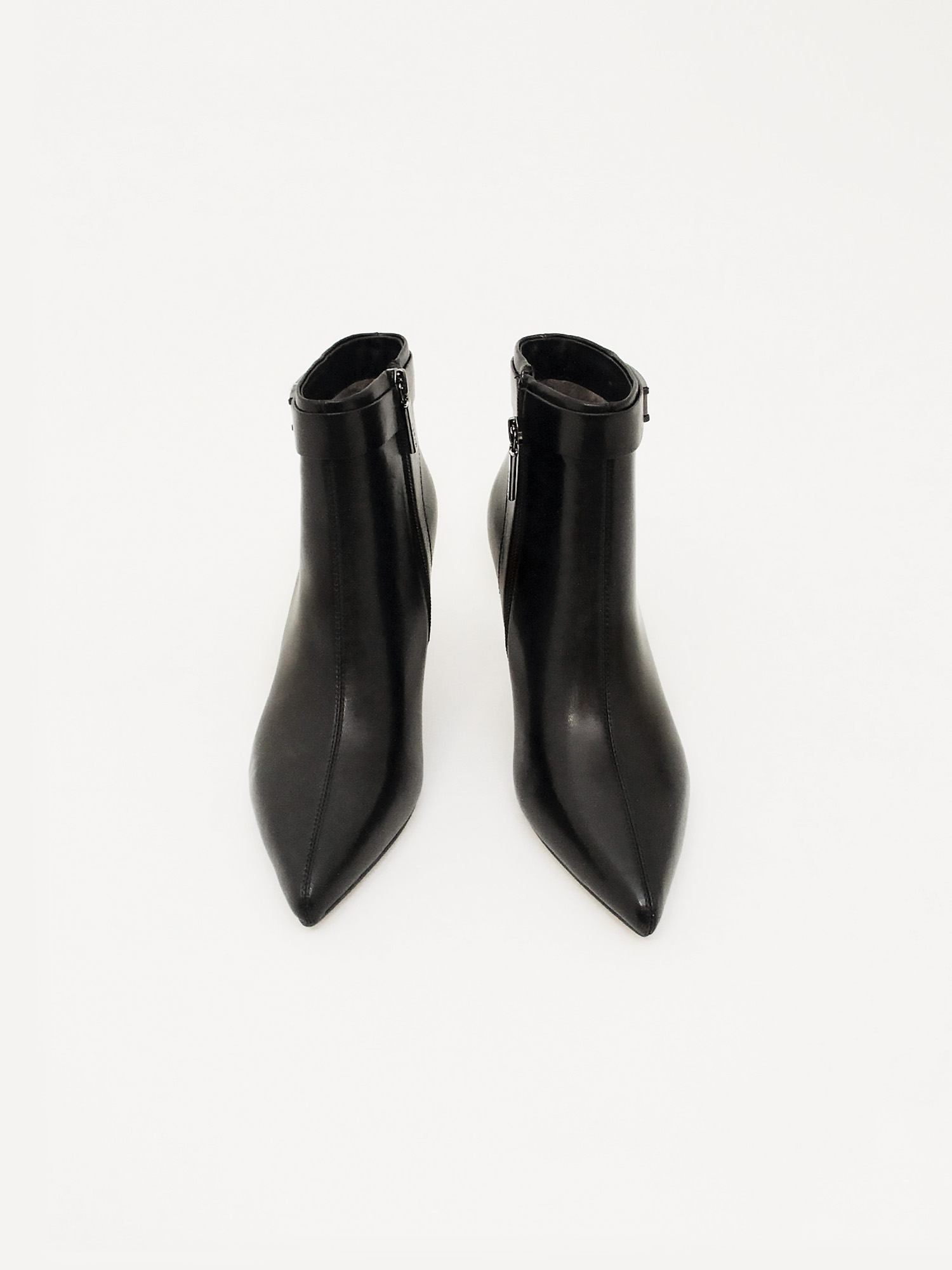 Женские ботильоны MYSET из натуральной кожи на высоком каблуке. Острый нос и изящный каблук добавляют модели женственности и изысканности. Утепленная подкладка из байки позволит комфортно себя чувствовать в прохладную погоду. На верхней части изделия на хлястике декор в виде металической пластинки.