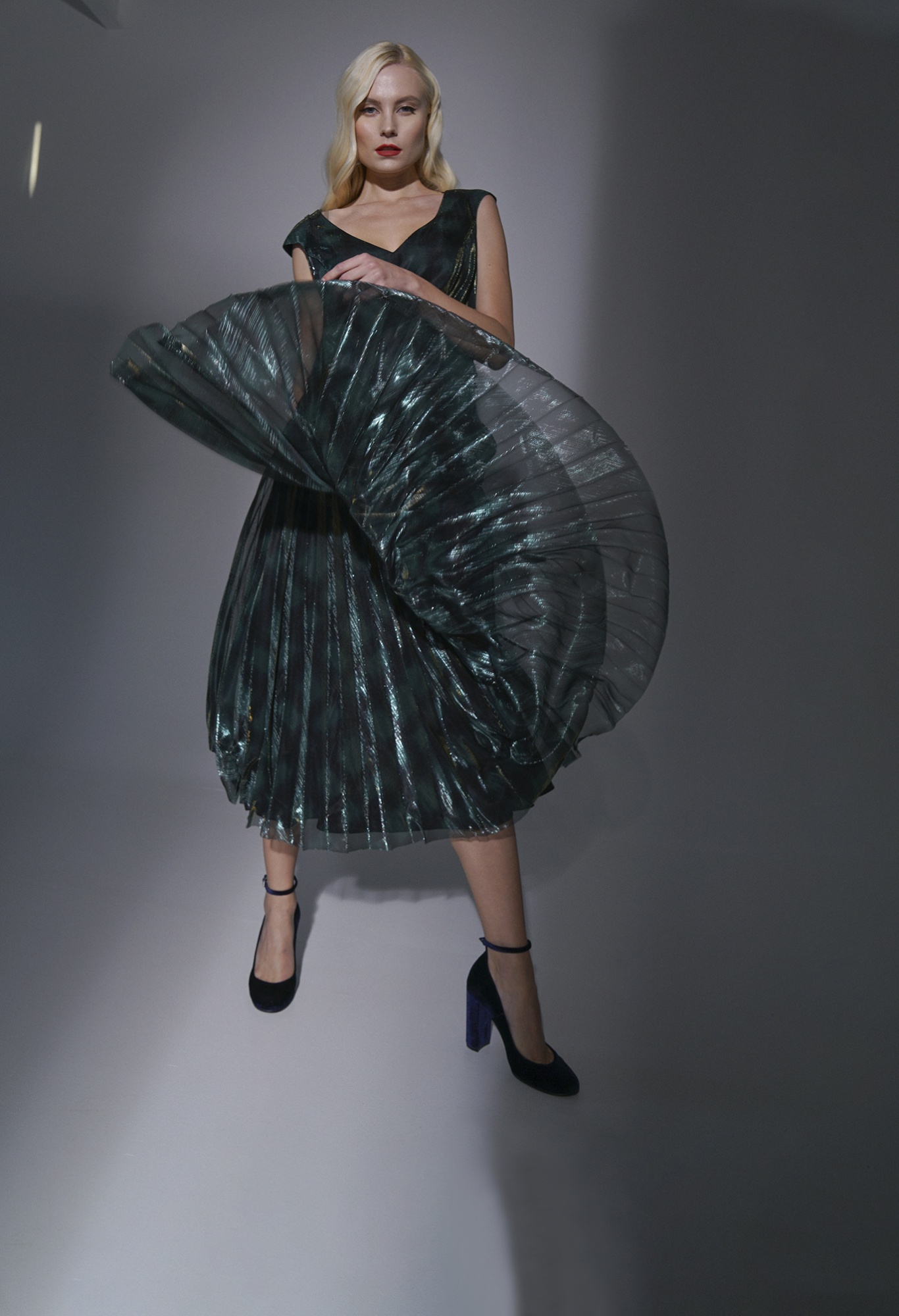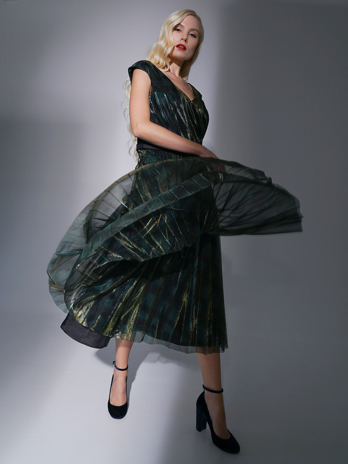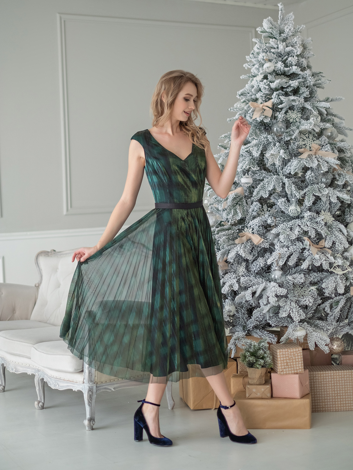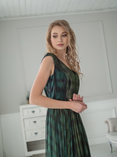На сайте указаны российские размеры. Яркое платье-хамелеон приталенного кроя. Дина миди, вырез горловины – фигурное каре. Пояс на талии отделяет плиссированную часть платья. Отсутствие рукавов выгодно подчеркнет руки. Платье создано, чтобы притягивать восторженные взгляды на новогодней вечеринке или любом вечернем мероприятии!