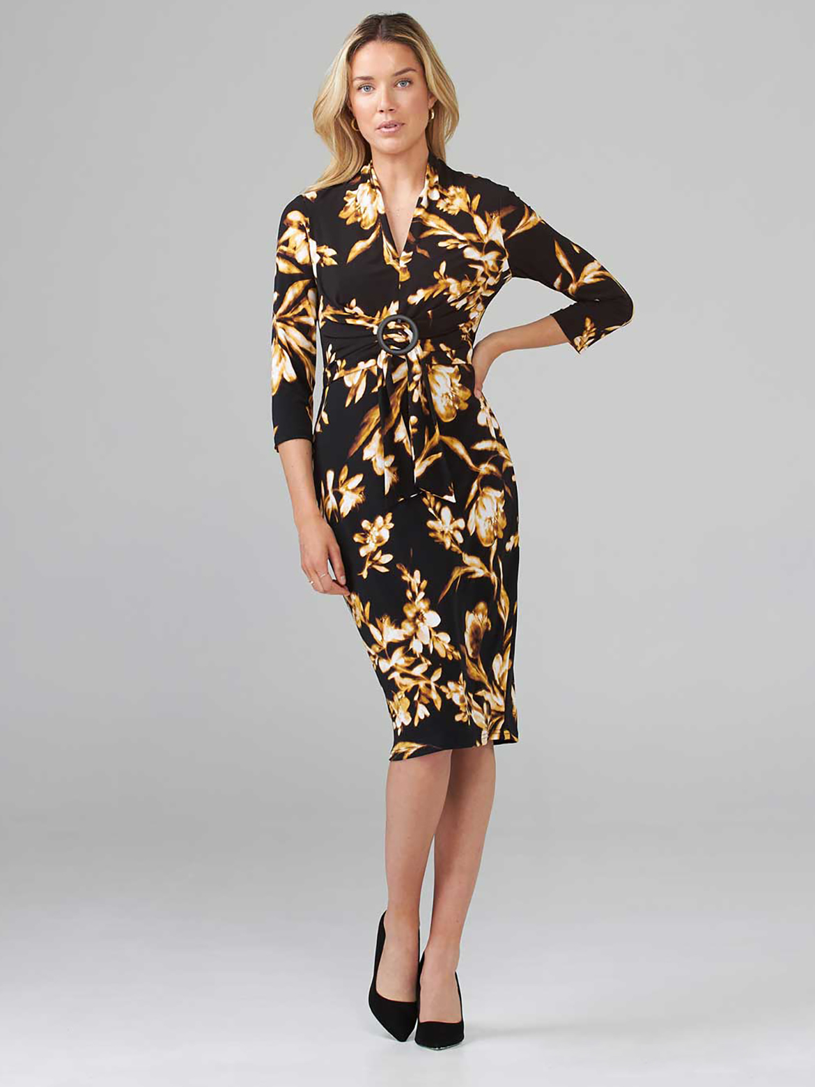 Платье миди с цветочным узором по всей поверхности изделия. Приталенный силуэт, длина ниже колена. V-образный вырез горловины, втачной рукав 3/4.