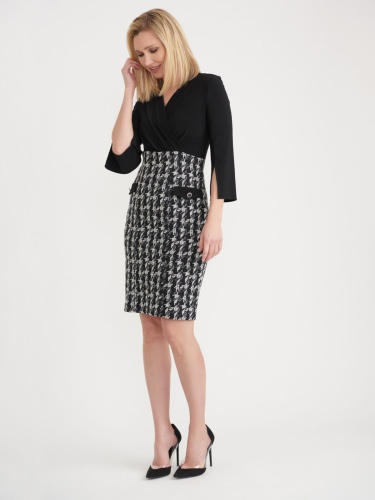 Платье миди с узором гусиная лапка на подоле изделия. Приталенный силуэт, длина ниже колена. V-образный вырез горловины, втачной рукав 3/4.