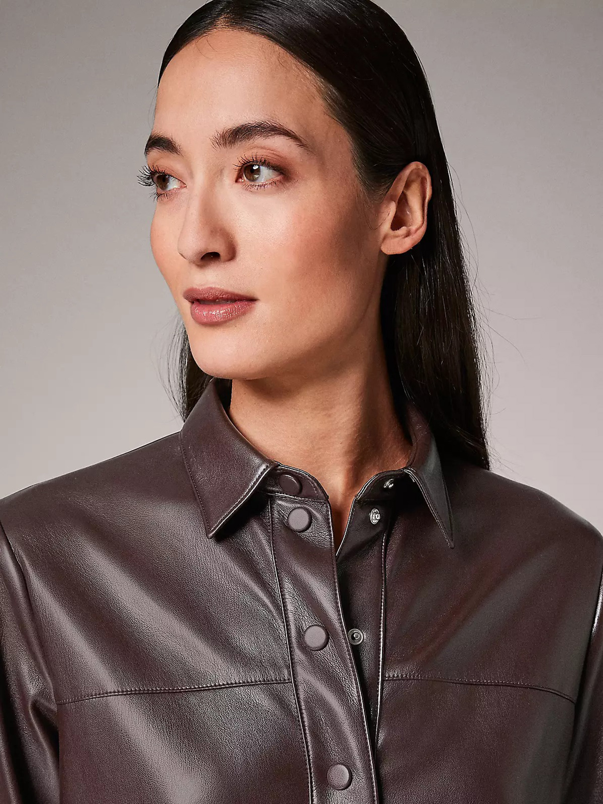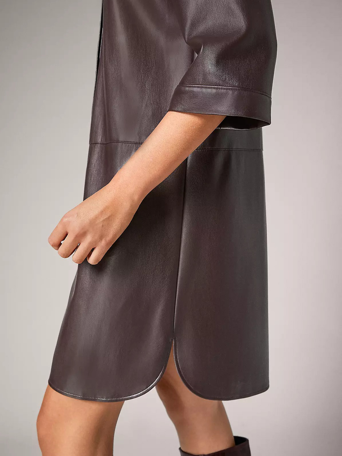Мини платье-рубашка из экокожи шоколадного оттенка. Отложной рубашечный воротник, планка с пуговицами в тон изделия. Втачные рукава длиной 1/2. Закругленный срез подола, небольшие разрезы по бокам.