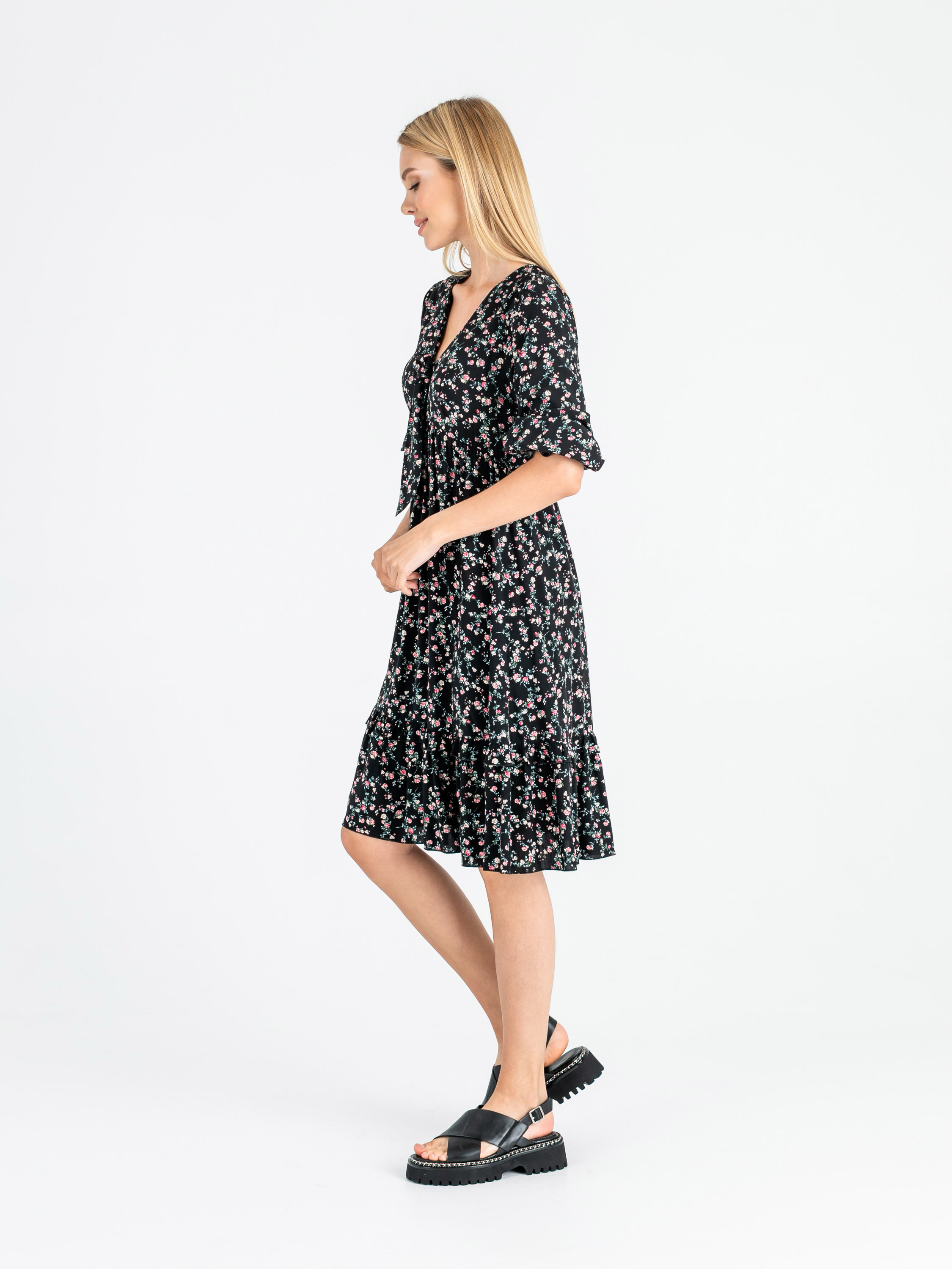 Приталенное платье с цветочным принтом. V-образный вырез с завязками. Рукав 2/4 на резинках.