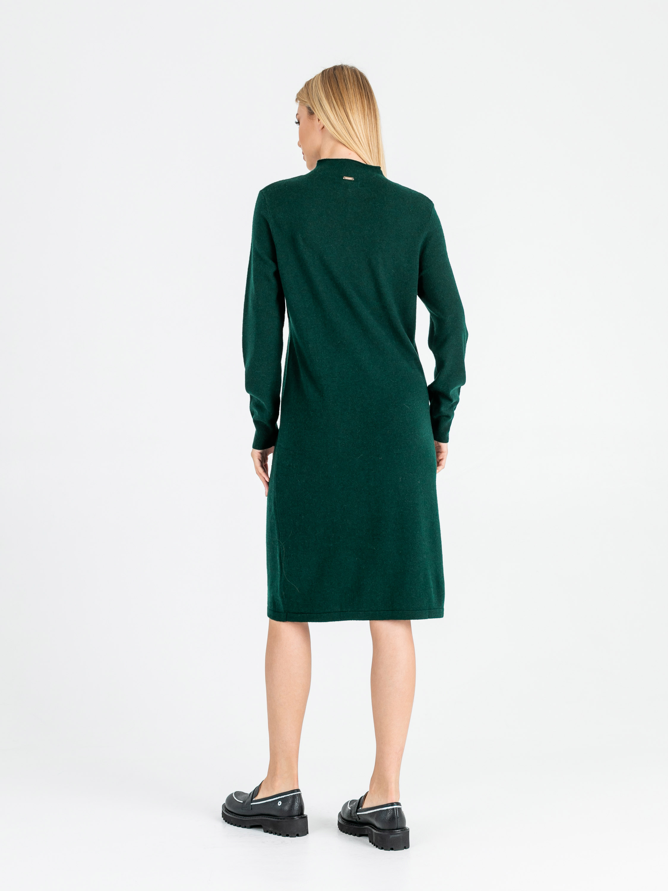 На сайте указаны российские размеры. Крой: теплое платье из плотного трикотажа прямого силуэта с длинным рукавом. Длина рукава регулируется при помощи манжета на резинке. Длина ниже колена, насыщенный изумрудный цвет. Стильная базовая модель с круглым, слегка поднятым вырезом, прикрывающим часть шеи. Идеально сидит на разных фигурах и подчеркивает достоинства. Плотность материала позволяет нивелировать возможные недостатки в области живота, бедер и талии. Отделка: в задней части платья расположен фирменный шильдик, говорящий о вашем прекрасном вкусе. Фактурная полоса в центре платья создает дополнительную вертикаль, которая визуально делает силуэт более стройным и вытянутым. Сочетайте с высокими сапогами-трубами, ботинками на грубой подошве и спортивной обувью. Рост 177 см