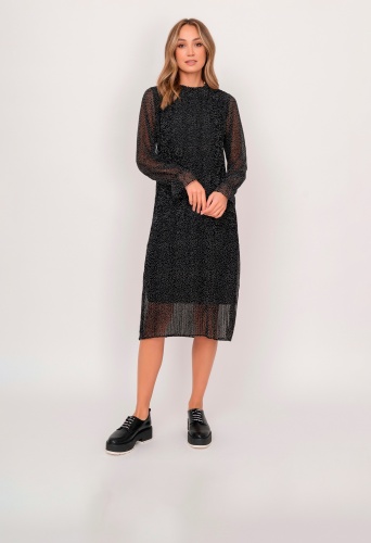 На сайте указаны российские размеры. Полупрозрачное черное миди платье трапеция в белый горох с круглым воротником, с длинным рукавом. Горловина и рукава дополнены воланами. Рост модели: 175 см. Длина платья: 110 см.