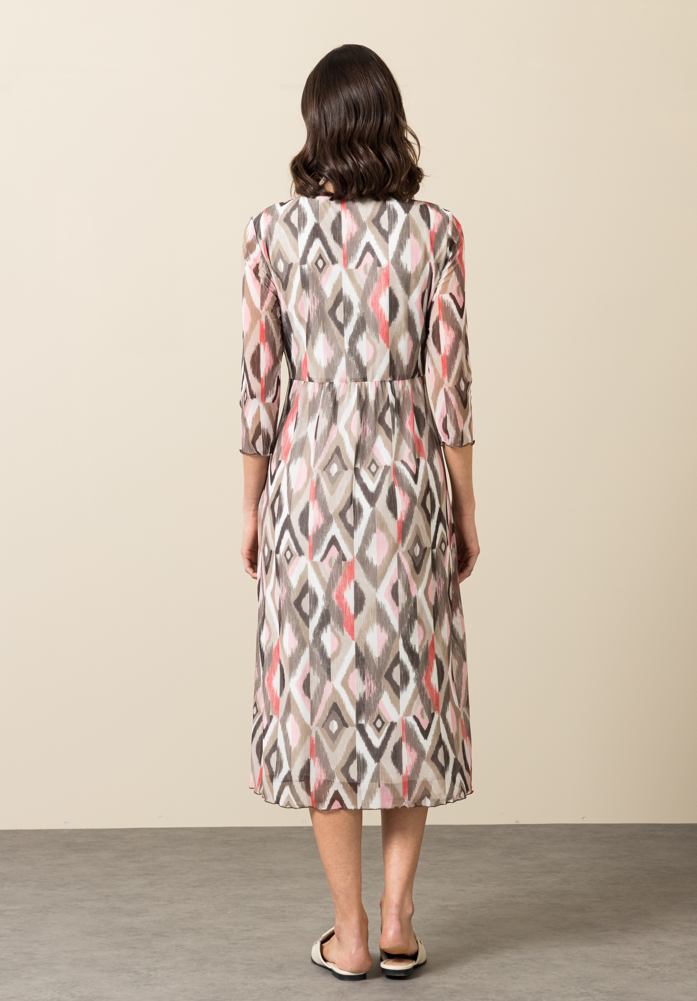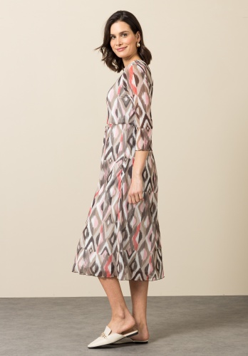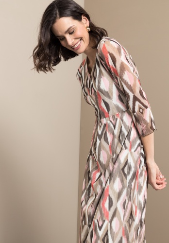 На сайте указаны российские размеры. Платье макси с V-образным вырезом и прозрачными рукавами 3/4. Высококачественный полиэстер с эластаном, подкладка из джерси. Деталь с пуговицами на вырезе. Длина юбки около 78 см, рост нашей модели около 180 см.