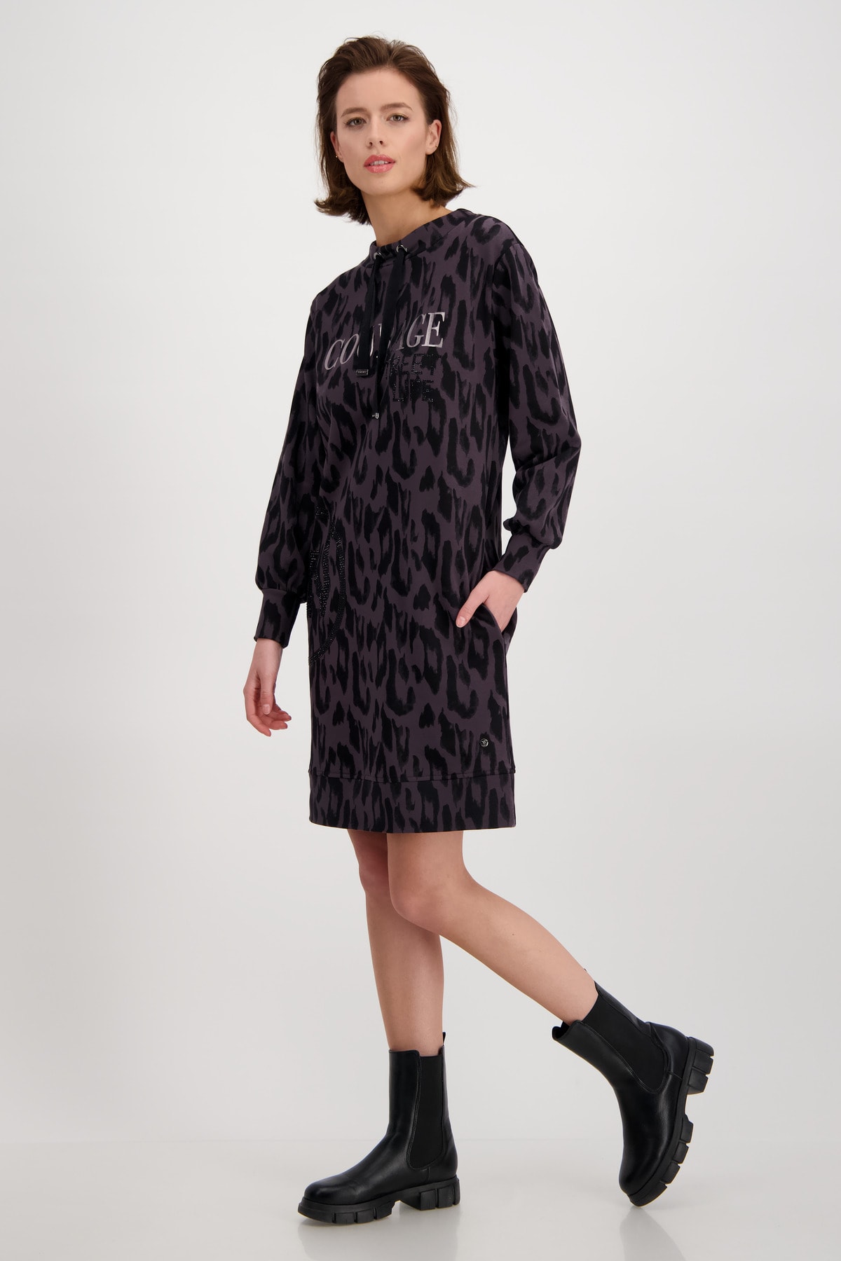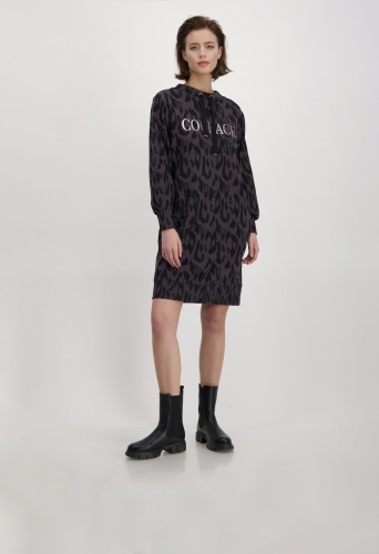 На сайте указаны российские размеры. Спортивное платье миди с воротником-стойкой и принтом по всей поверхности. Это изделие привлекает всеобщее внимание сплошным леопардовым принтом, а лицевая сторона украшена лакированными буквами и стразами, а также сверкающей эмблемой из страз. С воротником-стойкой на кулиске, люверсами и завязками, широкими манжетами с рюшами на концах рукавов и широкой манжетой по низу модель миди прямого кроя предстает с лучшей стороны. Карманы в боковых швах завершают стильный образ. Хлопок в смеси также обеспечивает отличный комфорт при ношении в течение дня. Модель ростом 178 см. Длина спины 44 размера составляет 96 см.