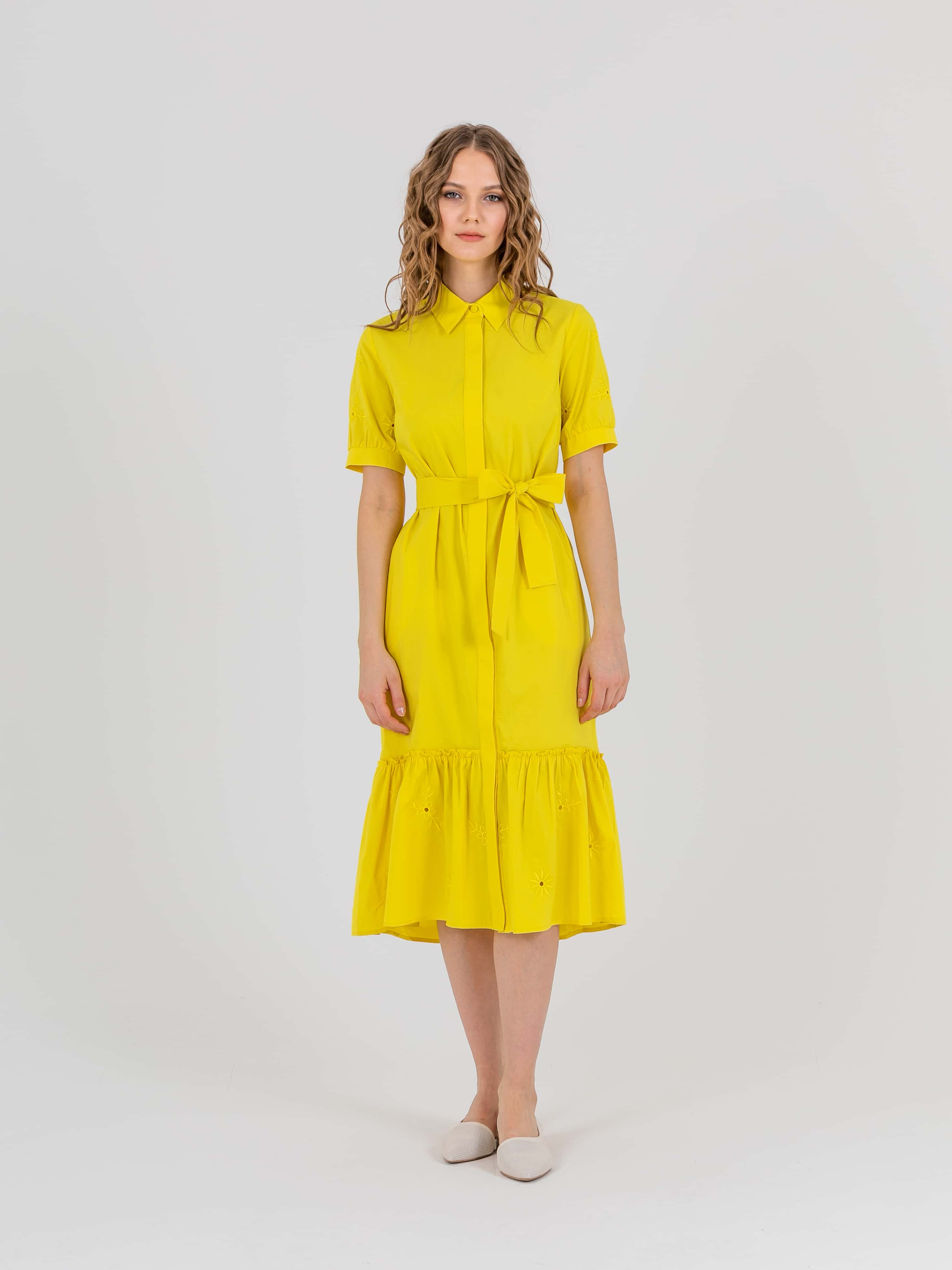 На сайте указаны российские размеры. Платье-рубашка А-силуэта длиной midi с оборкой по низу, дизайнерская особенность - потрясающее хлопковые шитьем растительного орнамента, есть съемный пояс. Перед с двумя вытачками на выпуклость груди, идущими из боковых швов. Застежка потайная на 10 пуговиц. Укороченные втачные рукава «фонарик» с манжетами. Стояче-отложной воротник.