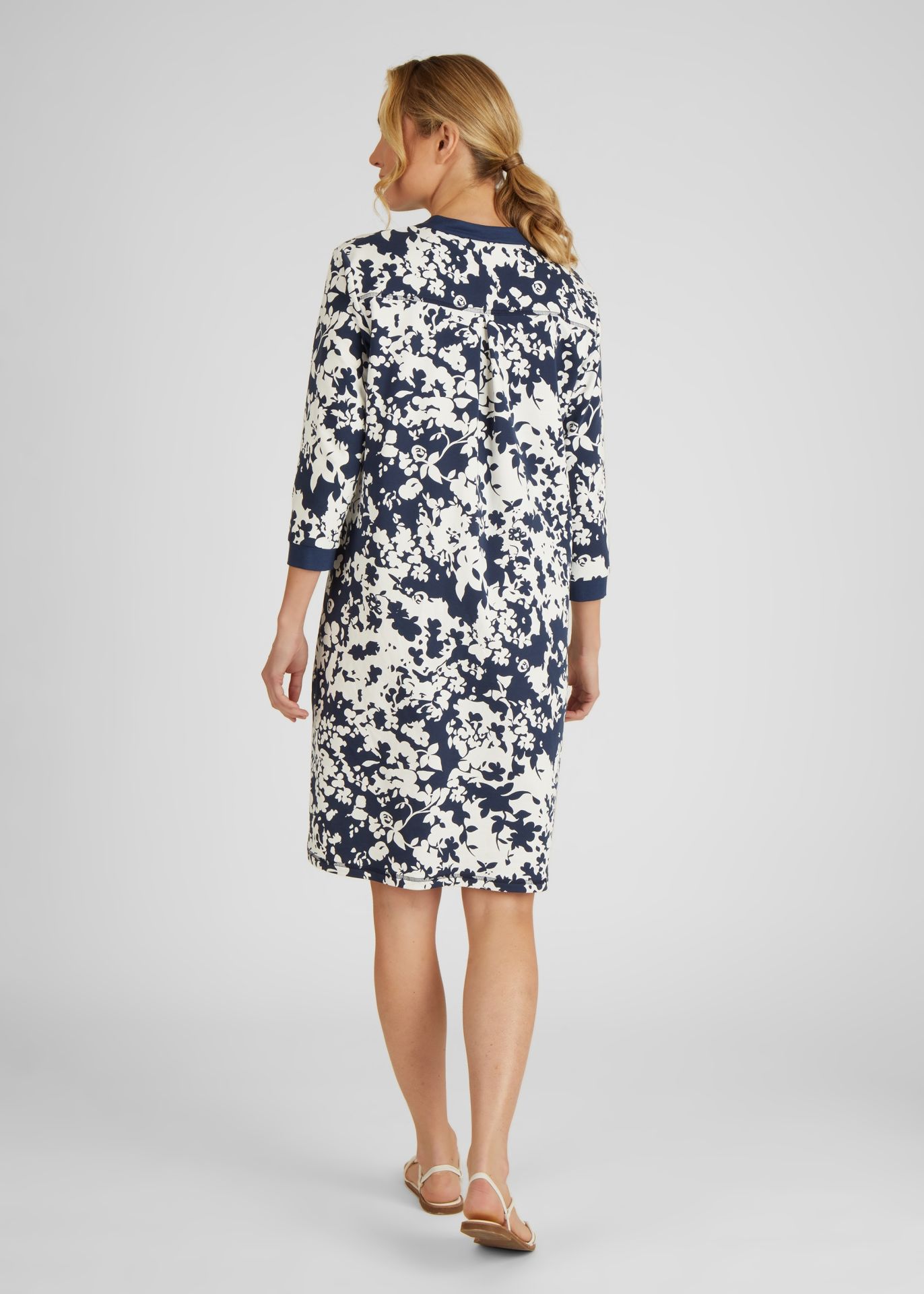 На сайте указаны российские размеры. Это платье прямой формы из хлопка сразу привлекает внимание своим абстрактным цветочным узором. Шнурок на воротнике и нашивные карманы придают платью спортивный вид. Рукава 3/4, накладные карманы, кулиска на воротнике. Рост модели 176 см. Длина по спинке от плеча для размера 46: 100 см.