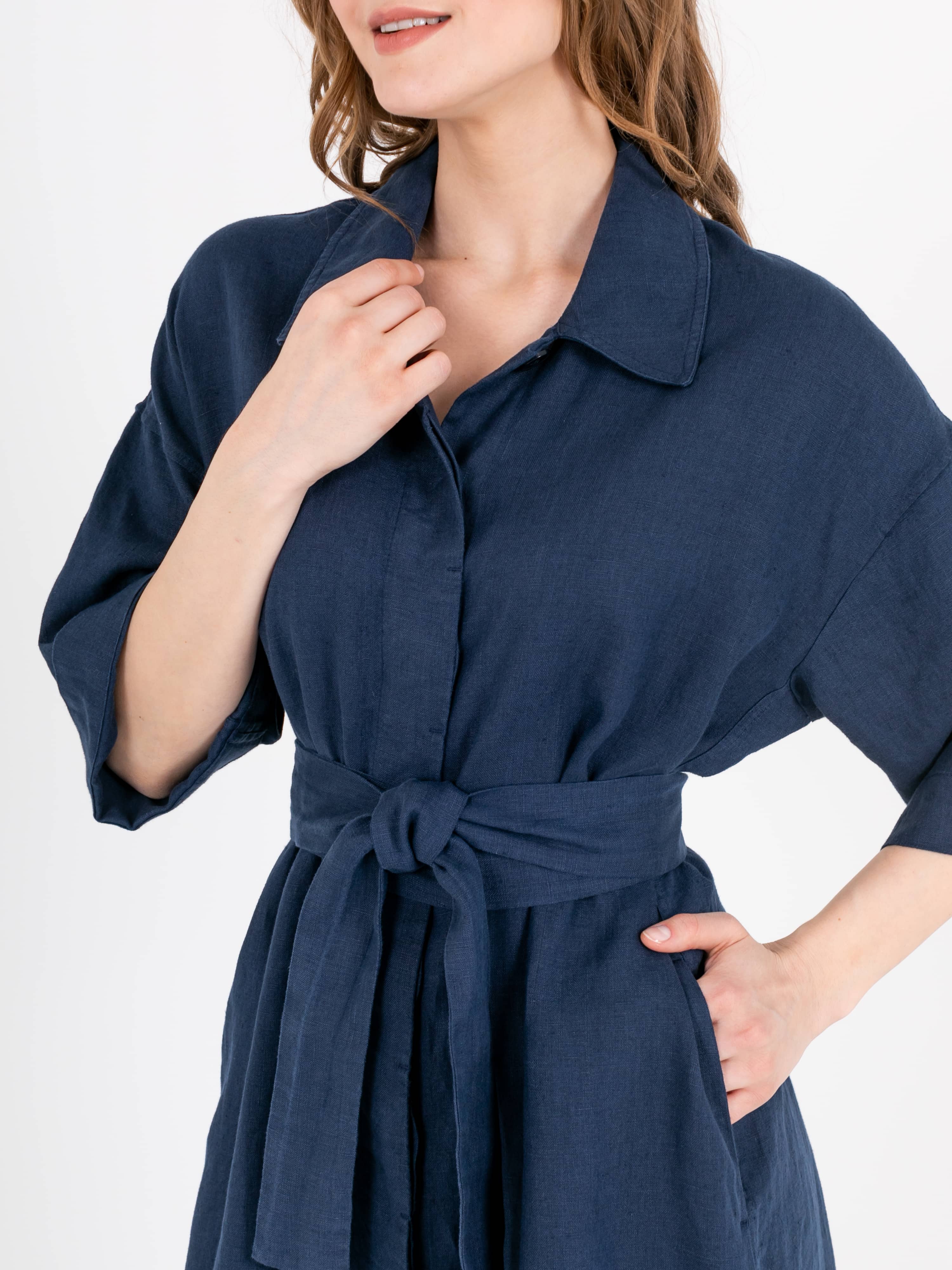 Платье-рубашка прямого силуэта длиной midi из натурального льна с потайной застежкой на 10 прорезных петель и пуговиц, с разрезами в боковых швах и съемным поясом. На спинке прямая кокетка. Укороченные цельнокроеные рукава со спущенной линией плеча. Стояче-отложной воротник.