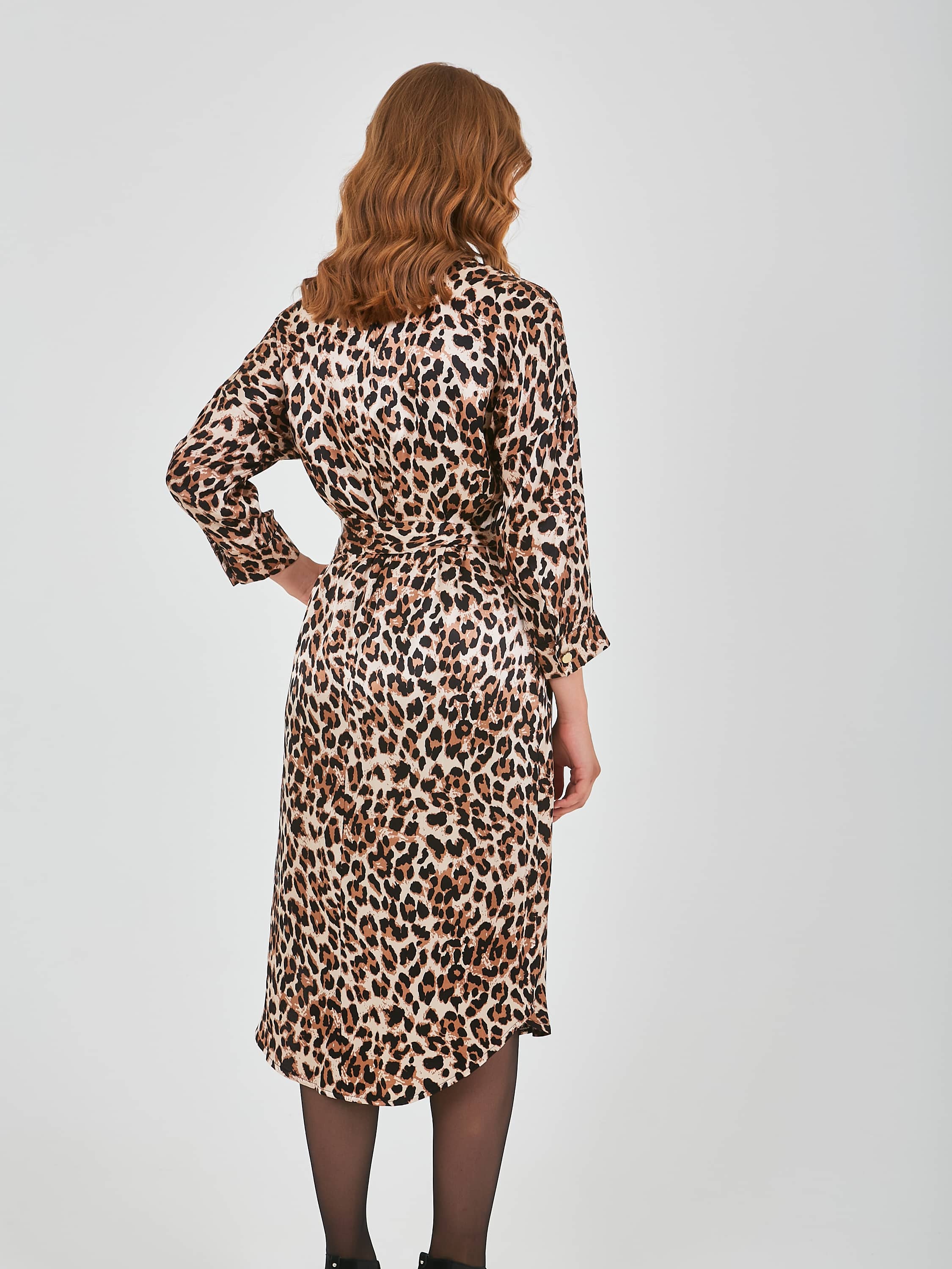Платье-рубашка прямого силуэта длиной midi с застежкой на 10 прорезных петель и пуговиц, с разрезами в боковых швах, ассиметричной линией низа и съемным поясом, дизайнерская особенность модели - леопардовый принт. По переду в области груди расположены два накладных кармана с клапанами, а в боковых швах располагаются прорезные карманы. Длинные втачные рукава со спущенной линией плеча и манжетами на прорезные петли и пуговицы. Воротник пиджачного типа.