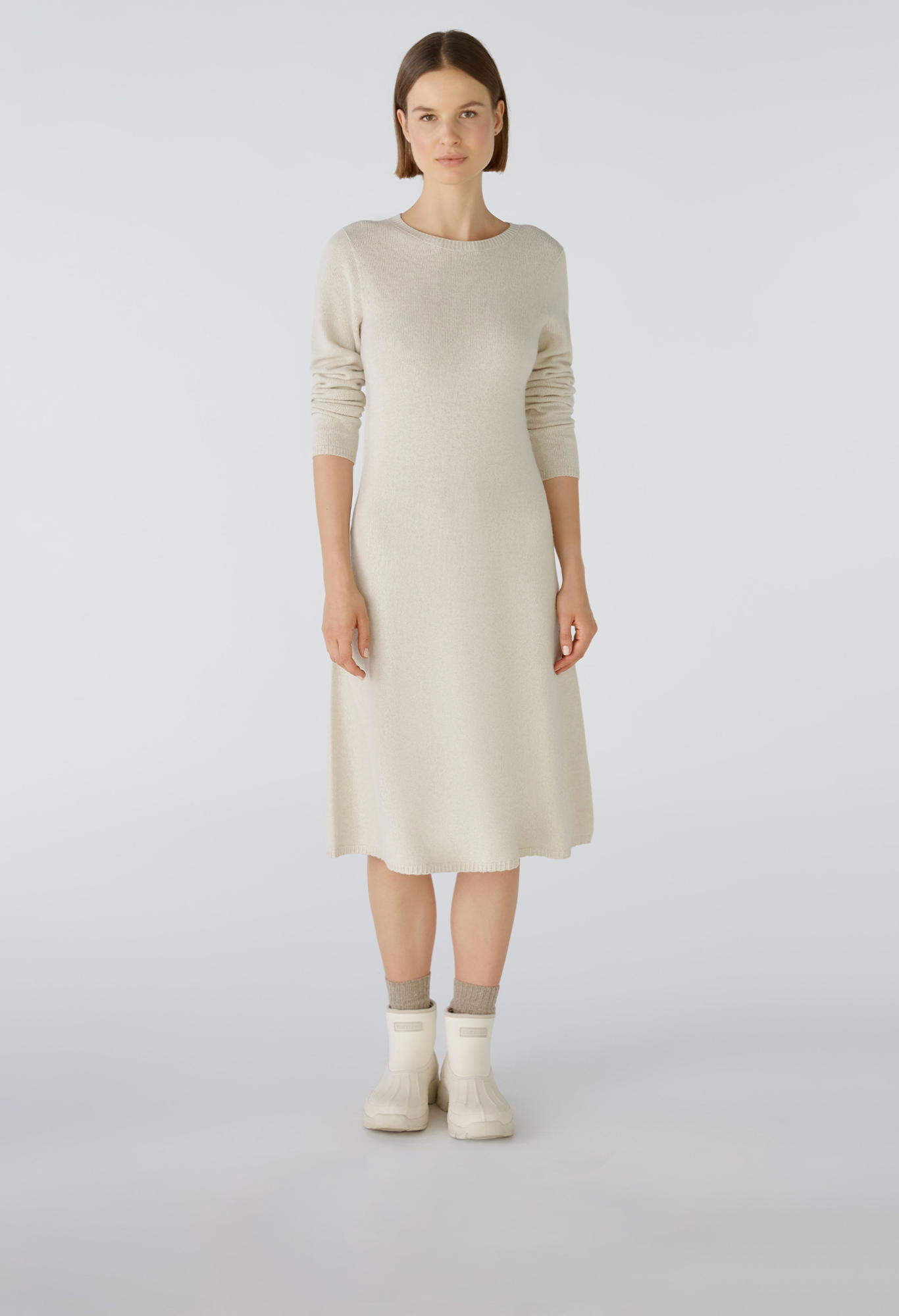 Трикотажное платье бесшовной вязки. Приталенный топ, слегка расклешенная юбка, длина до колена. Круглый вырез. Удлиненный рукав. Узкие ребристые манжеты на воротнике, рукавах и подоле. Длина для размера 42 - 106 см.