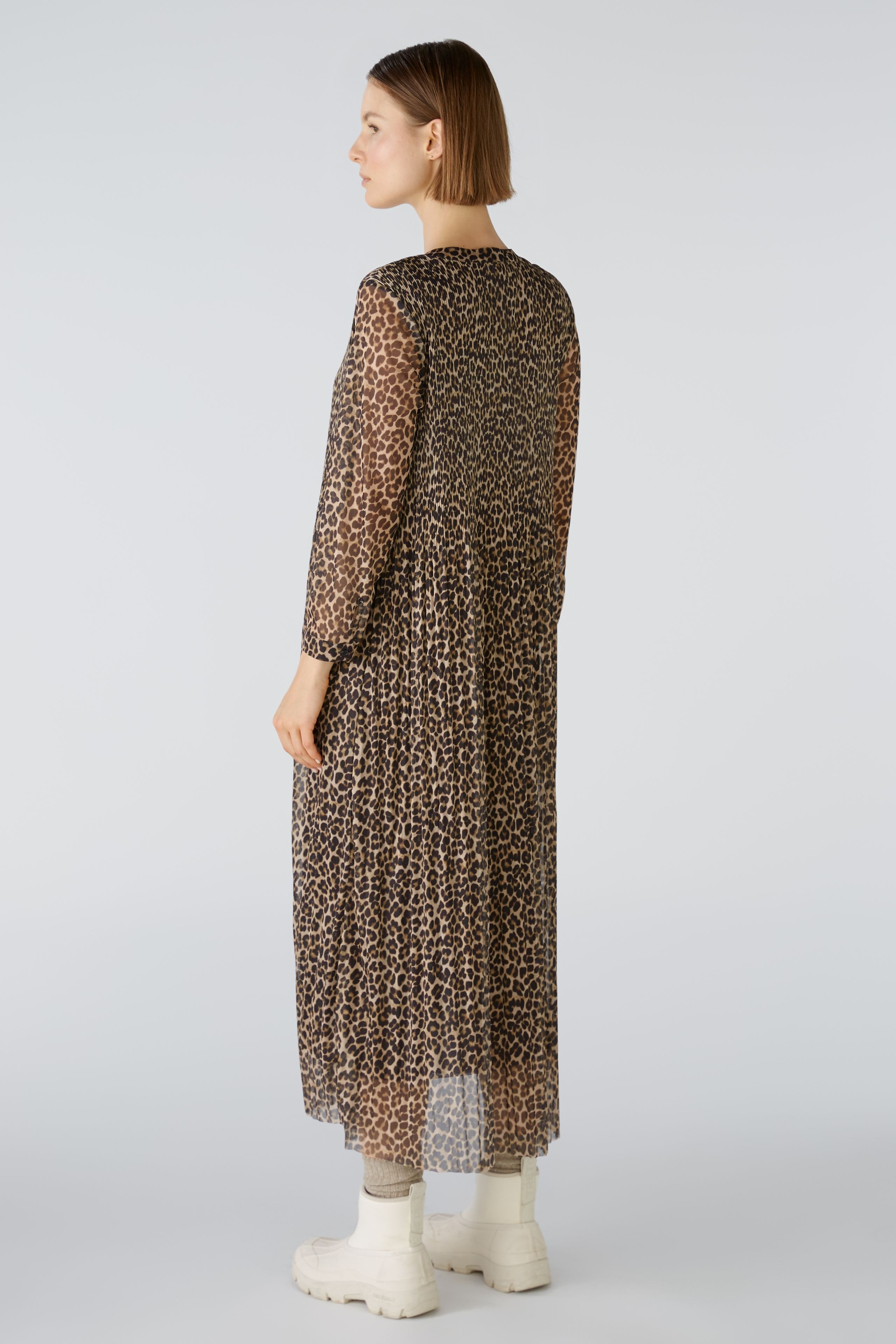 Струящееся платье из сетки со складками и принтом по всей поверхности. Свободный крой, длина миди. Круглая горловина с длинной планкой на пуговицах, легко надевается. Рукава длиной 3/4 с манжетами и маленькой пуговицей. Плотно прилегающие складки на верхней части тела, свободные и струящиеся в области юбки. Длина для размера 42: 126 см.