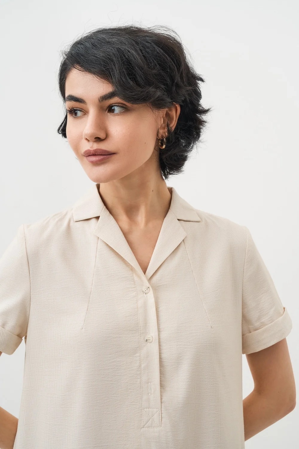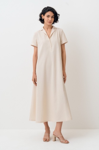Платье А-образного силуэта. По горловине, до уровня талии, планка с лацканами. Воротник - отложной. Рукав с притачной манжетой-отворотом. Карманы в боковых швах.