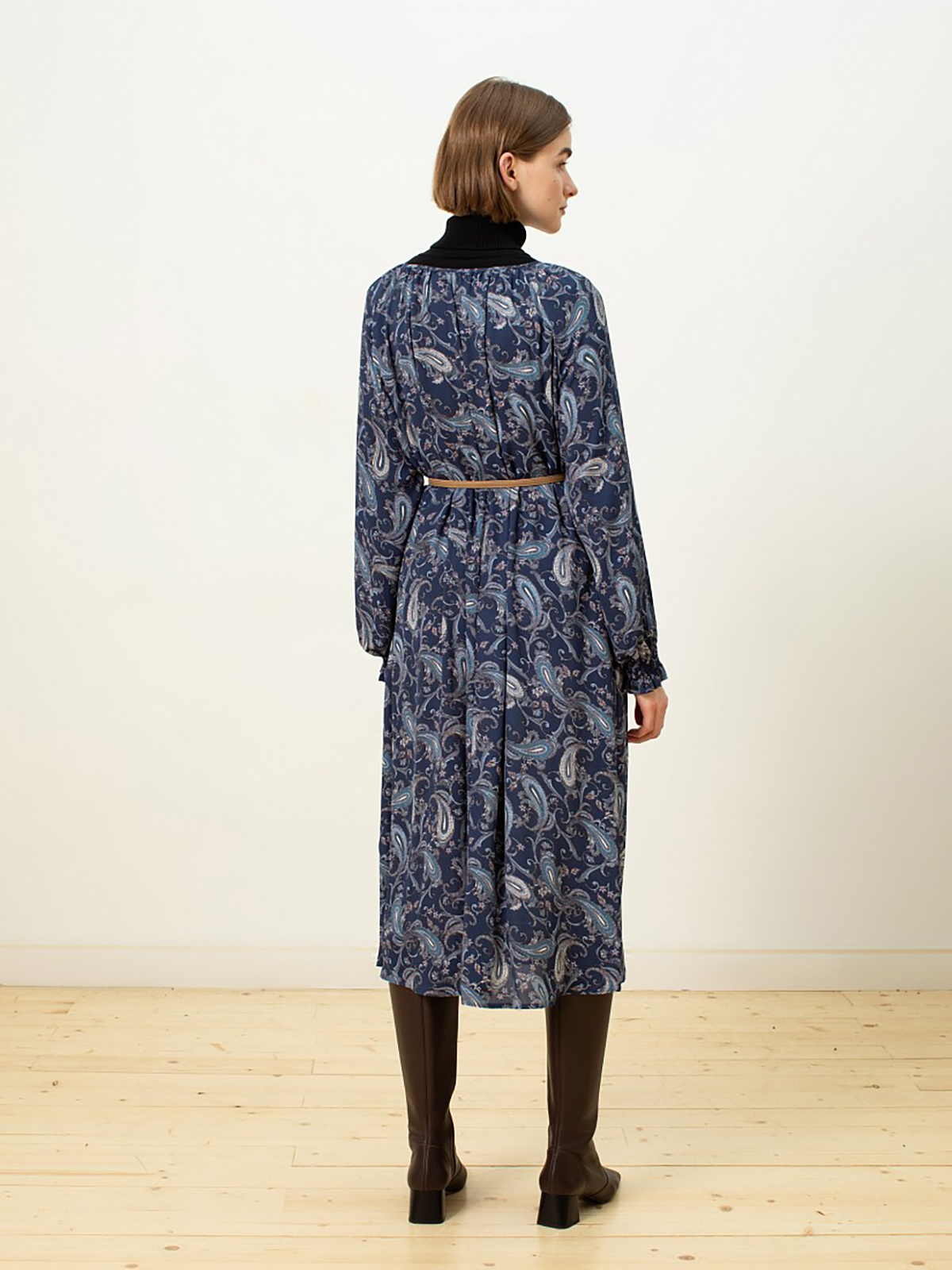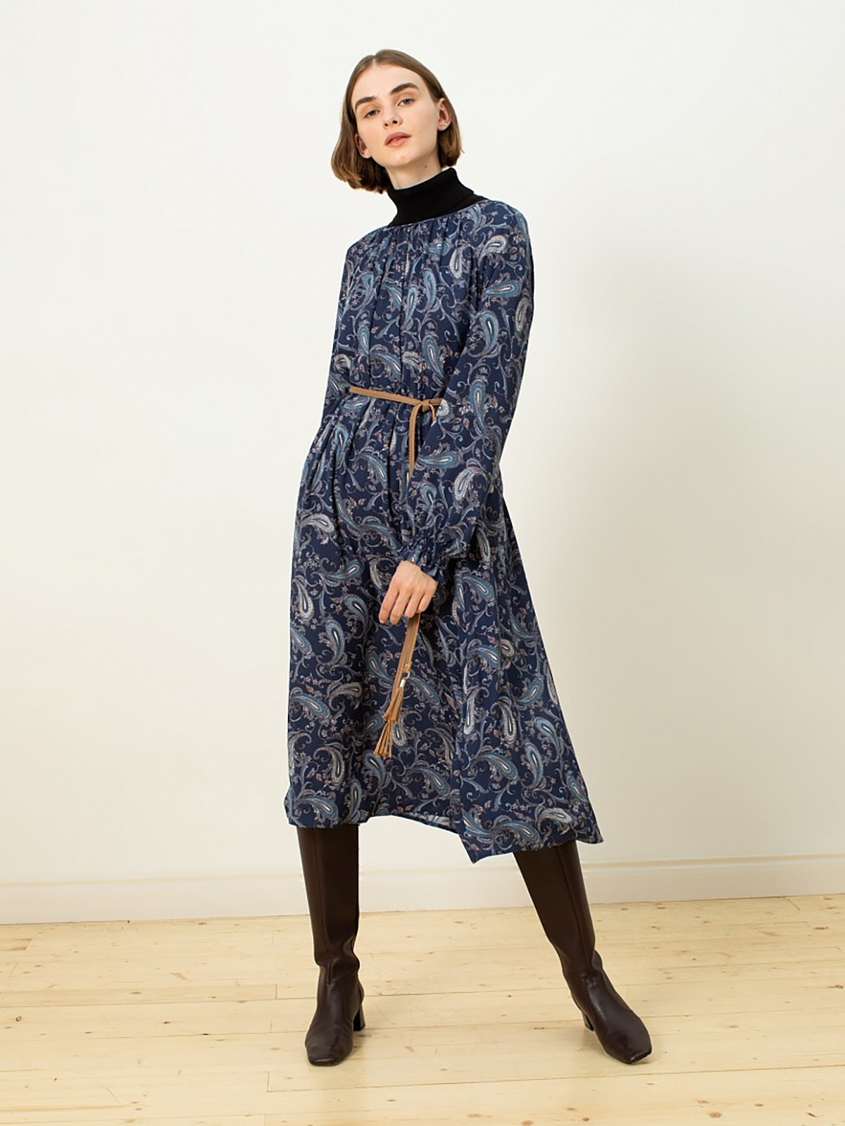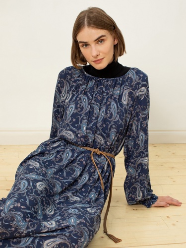 Романтичное платье миди с орнаментом пейсли по всей поверхности. Широкий овальный вырез горловины со сборкой. Длинные рукава реглан. В комплекте идет притачной пояс из экокожи.