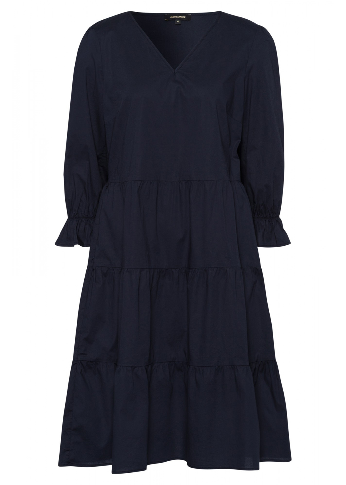 Однотонное платье свободного кроя с рельефами подойдет как для делового, так и для повседневного образа. Носите его с кроссовками, сандалиями или каблуком в зависимости от случая. V-образный вырез горловины. Втачной рукав ¾ с оборками.