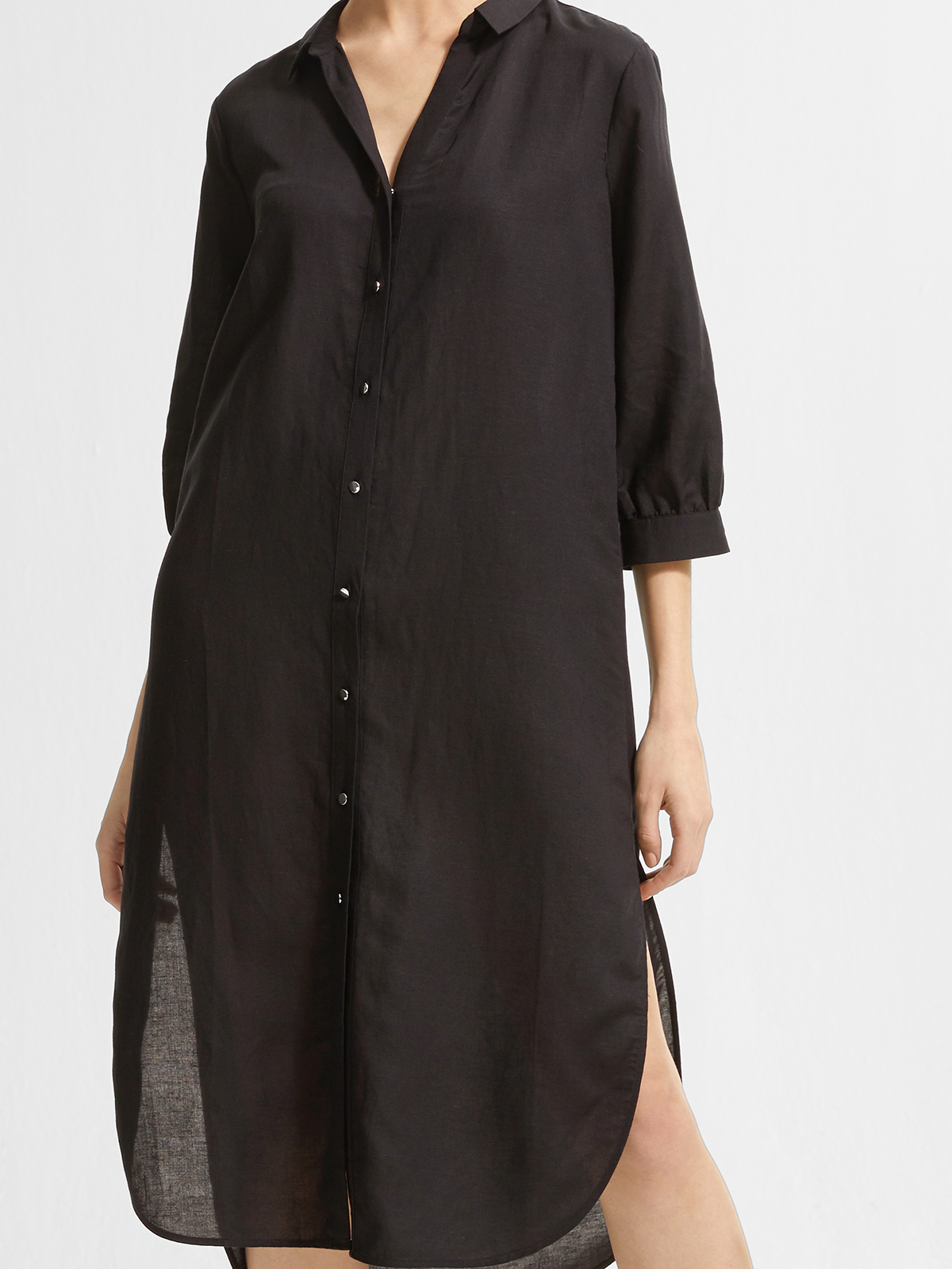 Однотонное платье-рубашка прямого кроя. Закругленый срез, удлиненная спинка. Рубашечный отложной воротник, планка с пуговицами. Втачной рукав 3/4 с манжетом.
