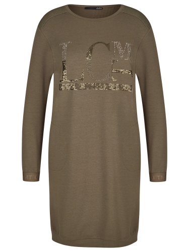 Однотонное трикотажное платье длины мини. Принт на груди богато украшен стразами и пайетками. Круглый вырез горловины, длинный втачной рукав.