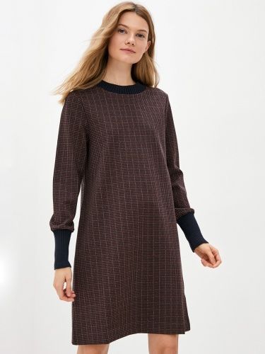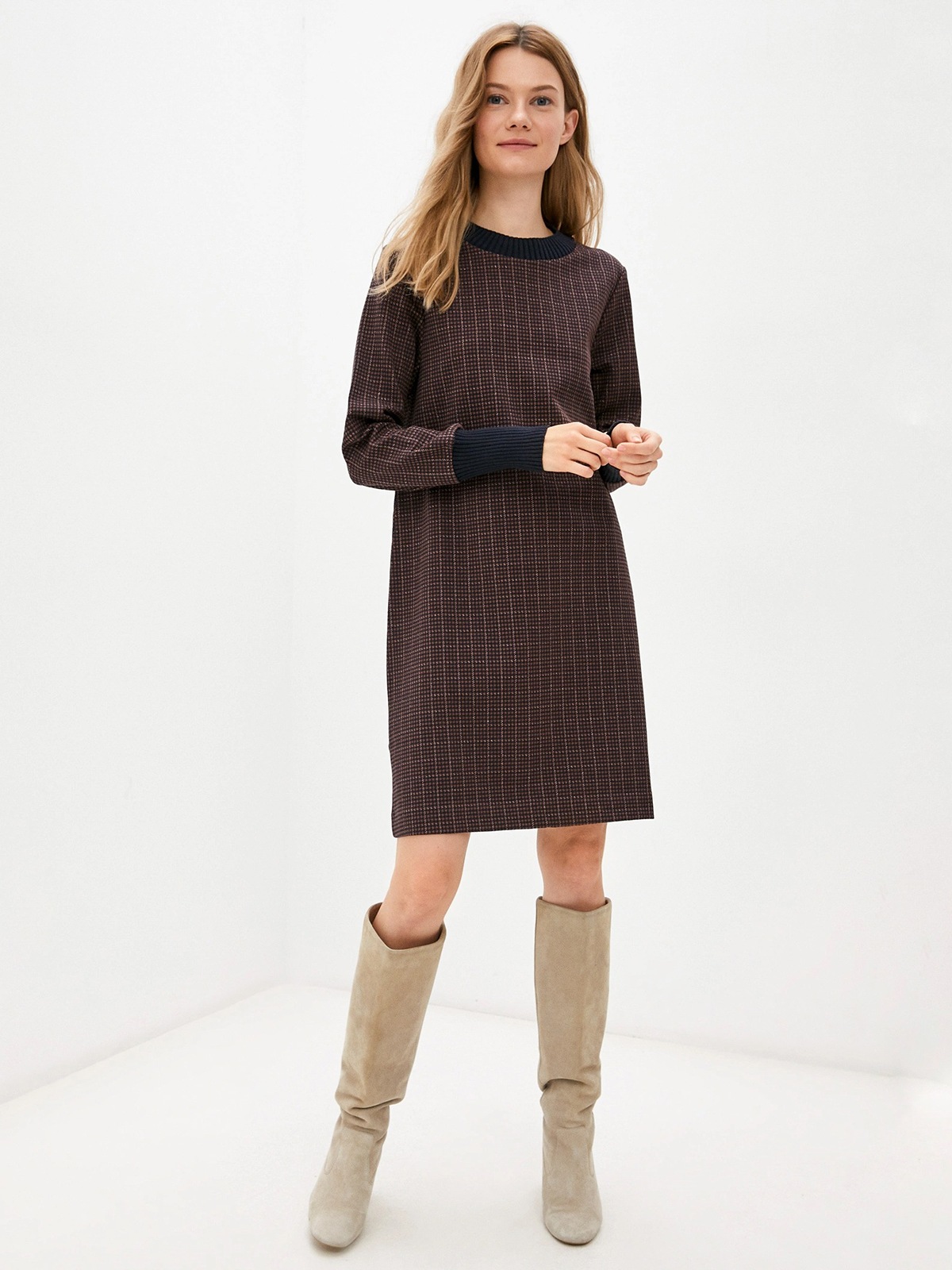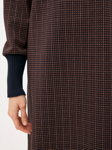 Платье прямого силуэта в мелкую клетку. Длинные втачные рукава с широкими эластичными манжетами в рубчик. Овальный вырез горловины.