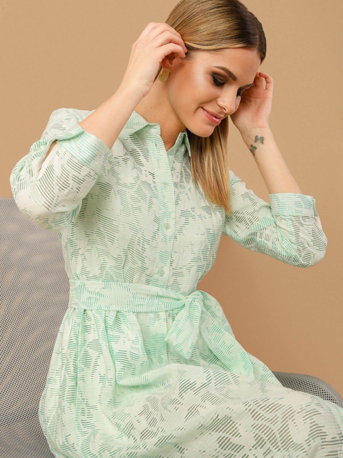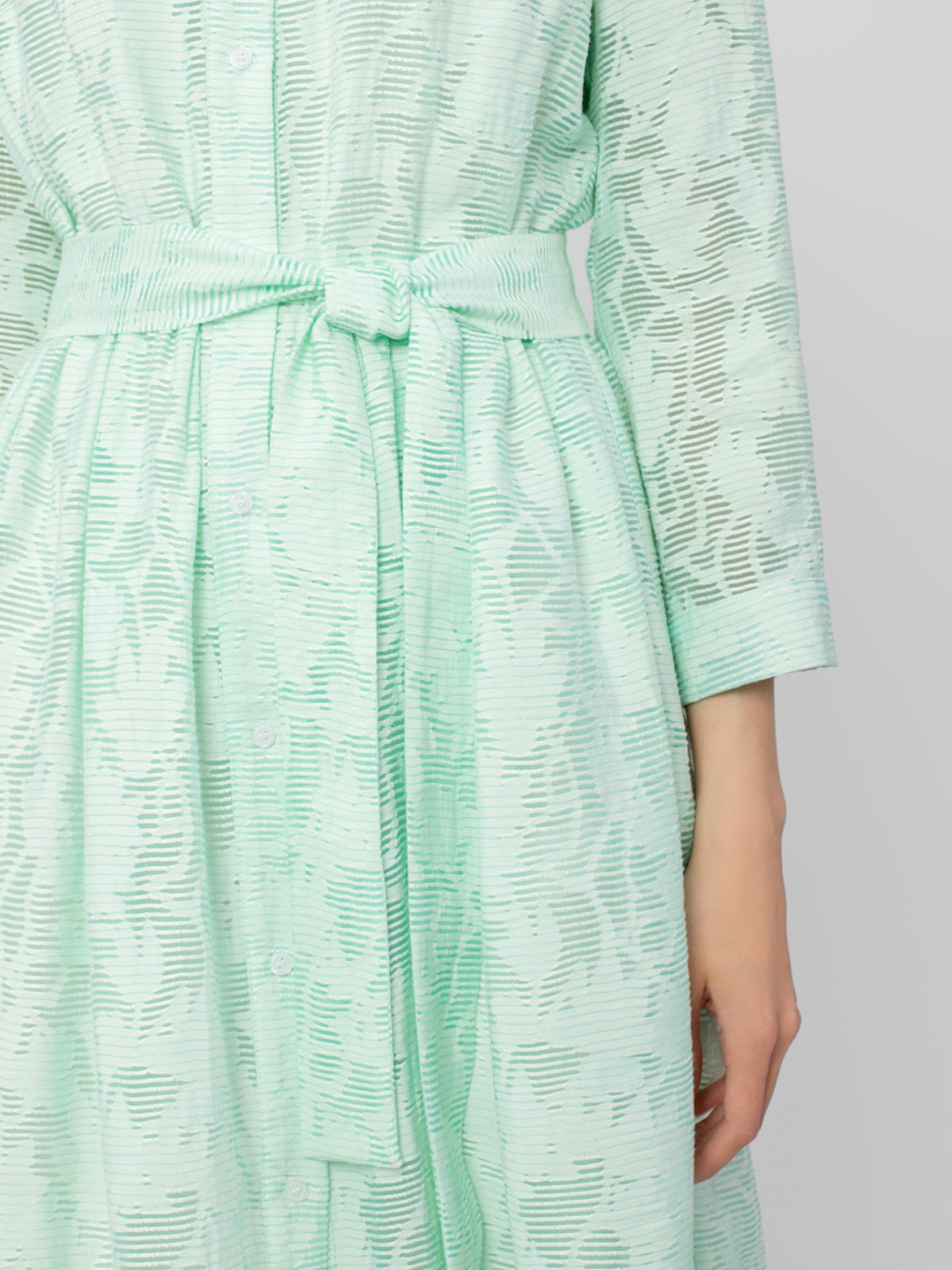 Платье-рубашка из плательной ткани с принтом. Силуэт трапеция, классический отложной воротник, втачной рукав на манжете, застежка спереди на пуговицы. На талии съемный пояс из основной ткани.