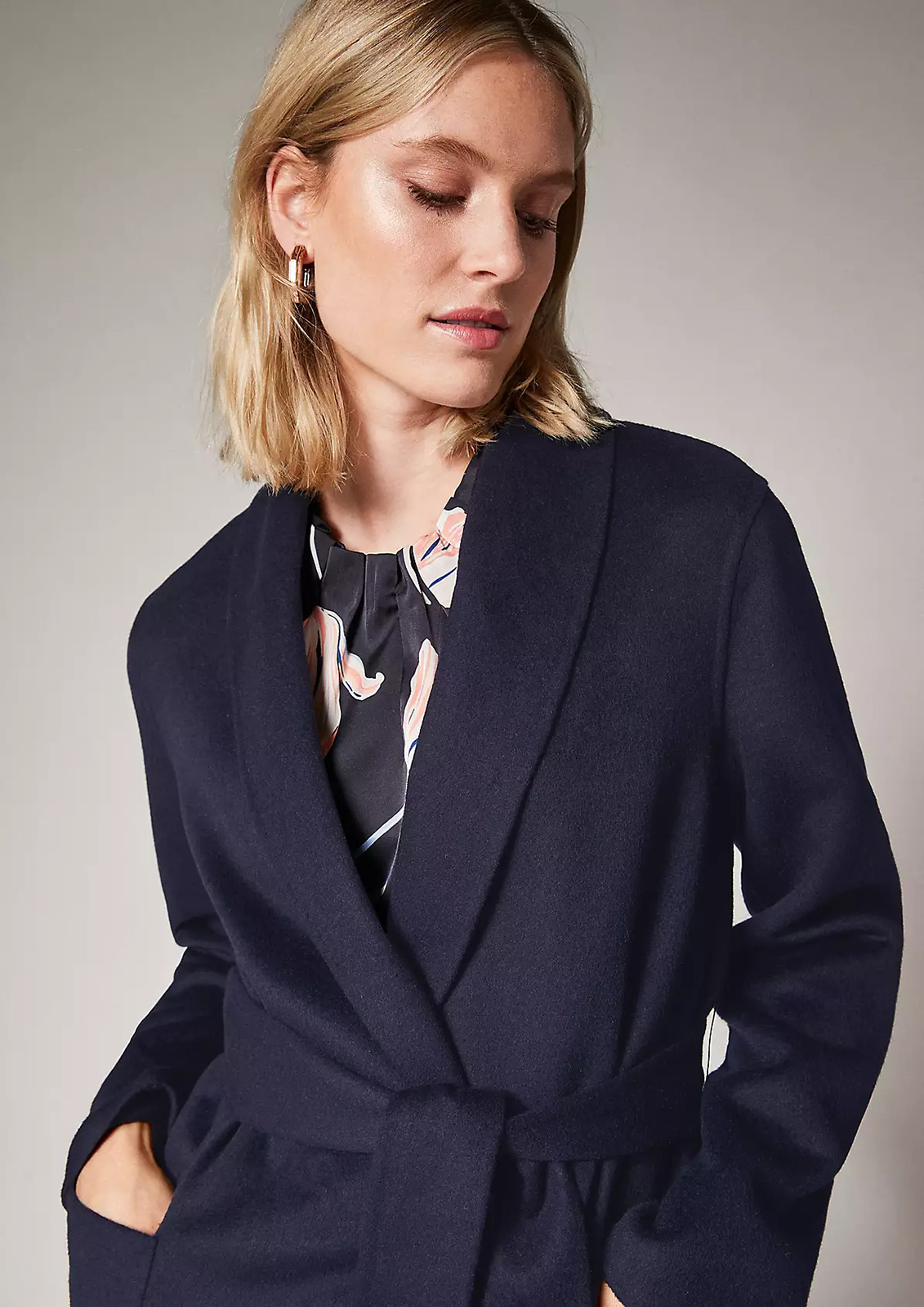 Драповое пальто-халат с отложным воротником с лацканами. В комплекте идет пояс из основного материала изделия. Накладные карманы.