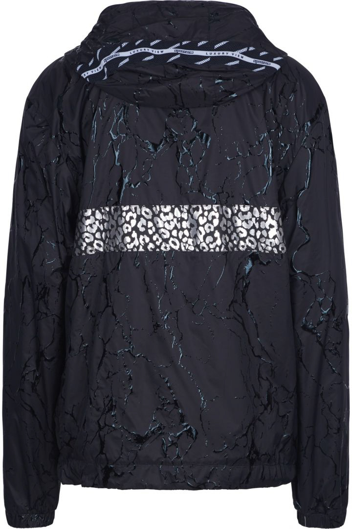 Анорак с анималистичным принтом по всей поверхности изделия. Модель украшают серебряная полоска на груди и спине. Дышащая сетка внутри куртки. Карман-клатч, молния на груди, капюшон и подол на кулиске делают образ одновременно элегантным и спортивным. Идеальная вещь для прогулок в городе и на природе.