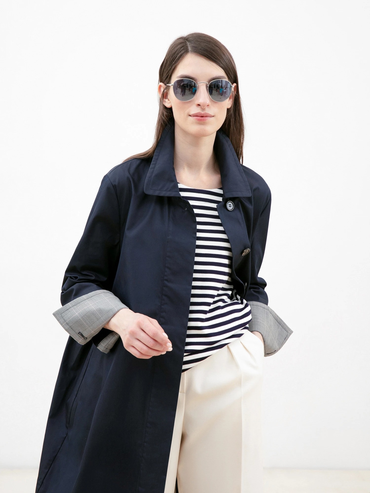 Плащ прямого силуэта из непромокаемой ткани темно-синего цвета. Аккуратный отложной воротник, классический втачной рукав. Низ рукава обработан широкой манжетой с застежкой на пуговицу. Изнаночная сторона манжеты имеет контрастную обработку для возможности отворота. Застежка супатная на ряд крупных пуговиц и одну роговую пуговицу для фиксации воротника. Длина плаща ниже колена, фигурный низ.