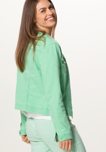 На сайте указаны российские размеры. Джинсовая куртка с особым воротником с бахромой. Благодаря сочетанию высококачественных материалов с эластичным эластаном, она очень удобна в носке и повторяет каждое движение. Планка на пуговицах спереди и особый воротник с бахромой, а также накладные нагрудные карманы делают эту модель абсолютно привлекательной. Длина в размере 44 около 54 см.