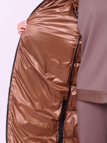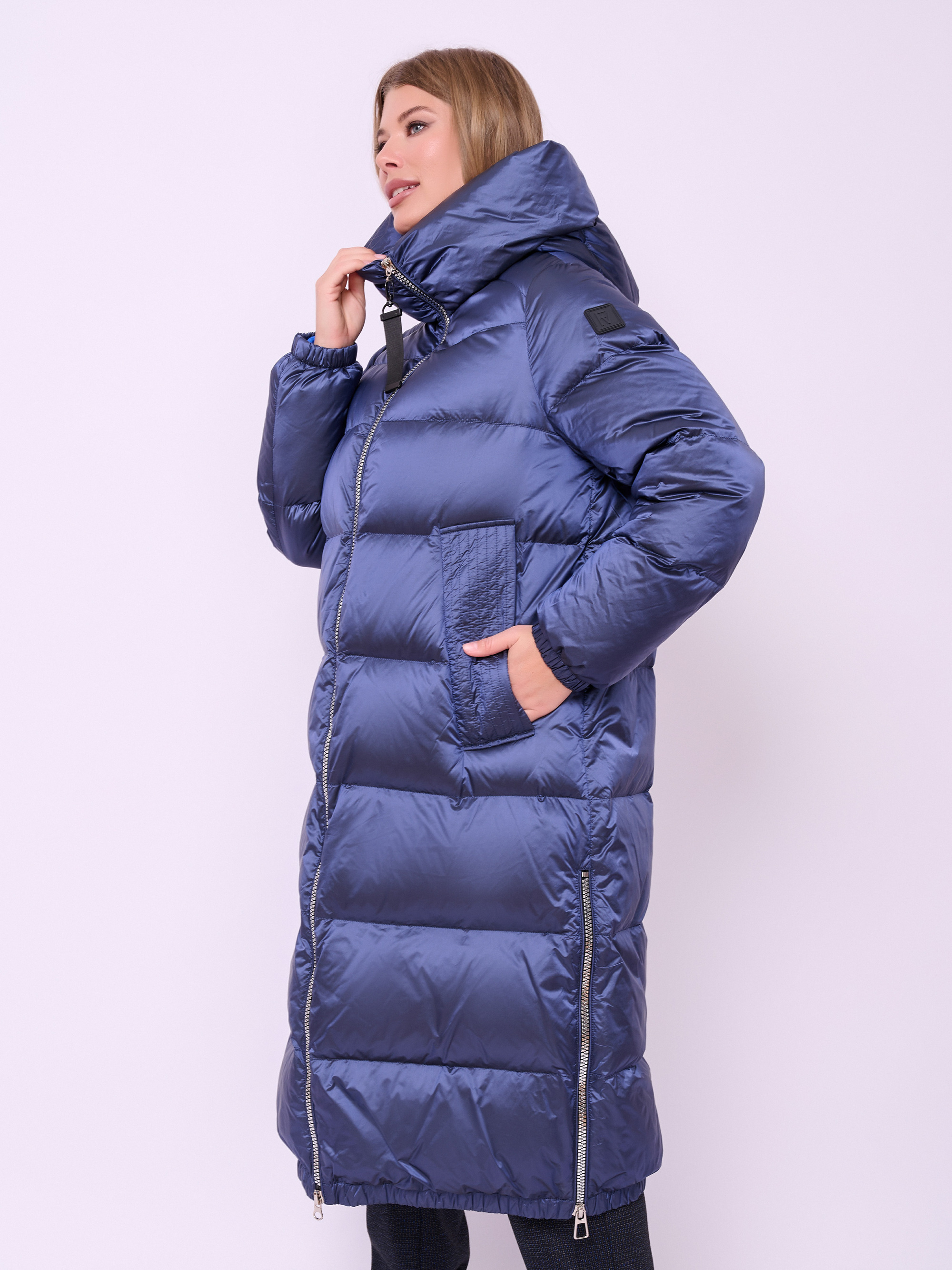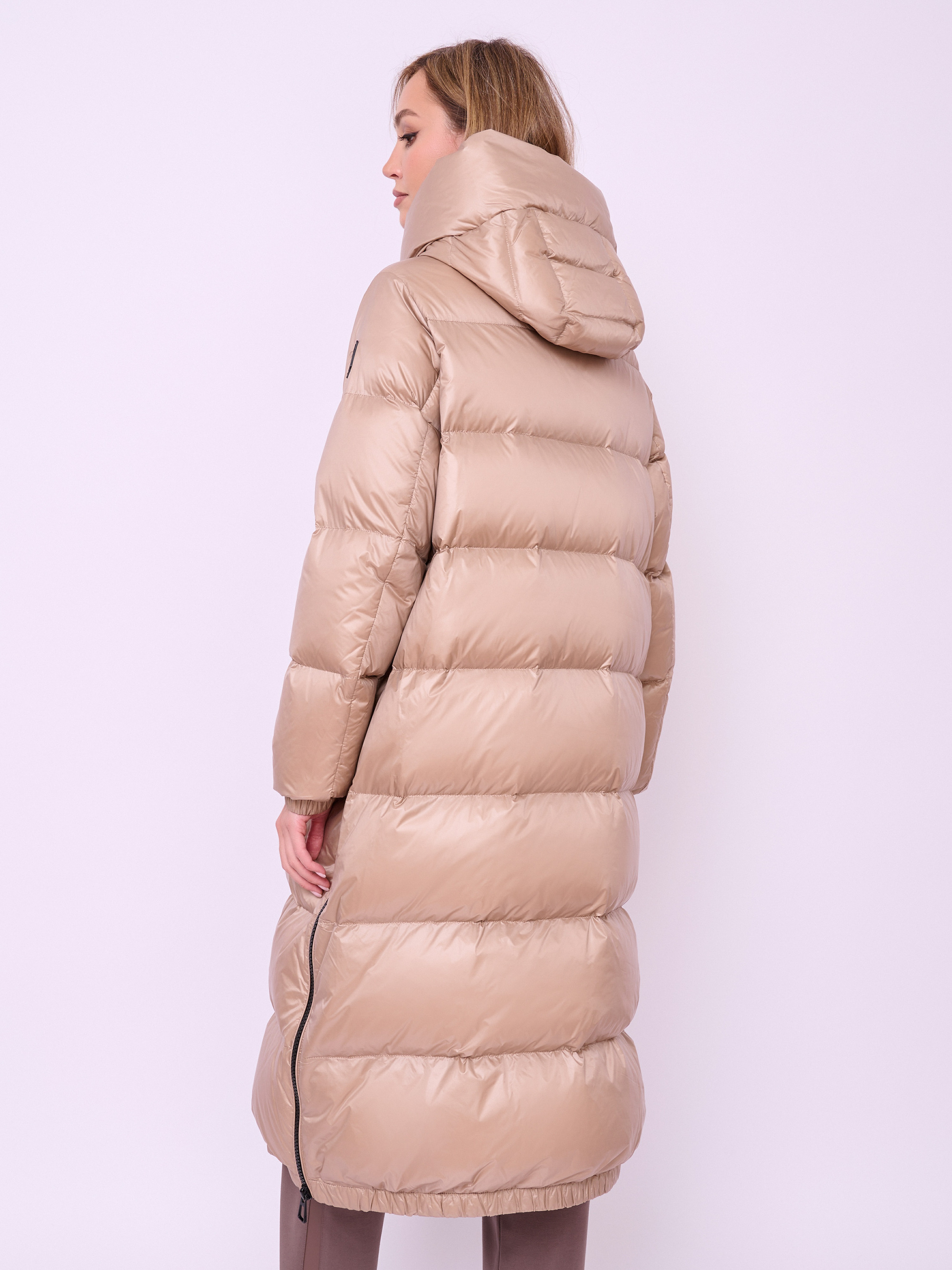 Пальто-пуховик стеганое с высоким воротом, несъемным капюшоном на кулиске без опушки, с длинными рукавами на резинке, прорезными карманами на магнитной кнопке, высокими разрезами на молнии и низом на резинке. Длина по спине: 112 см