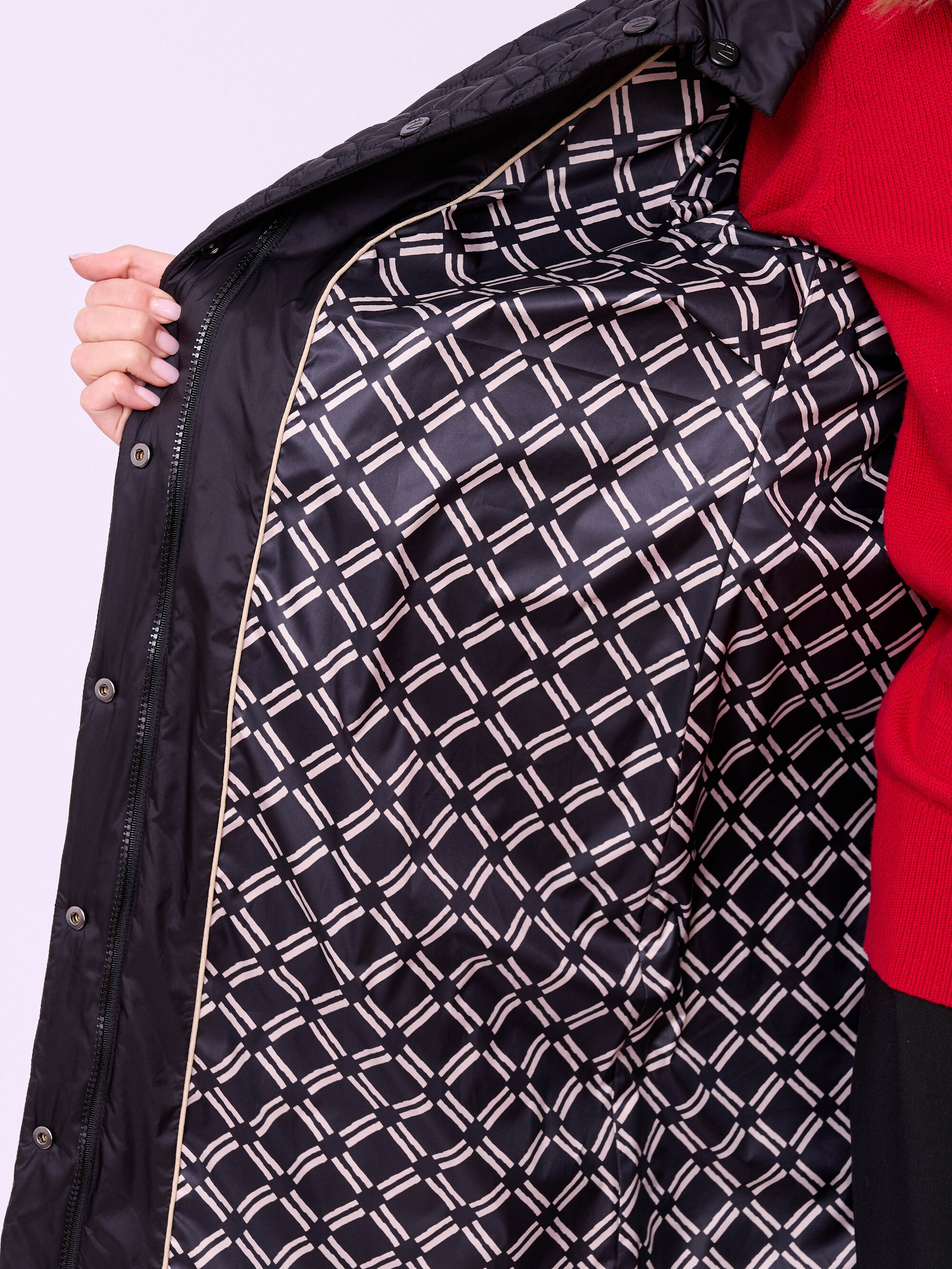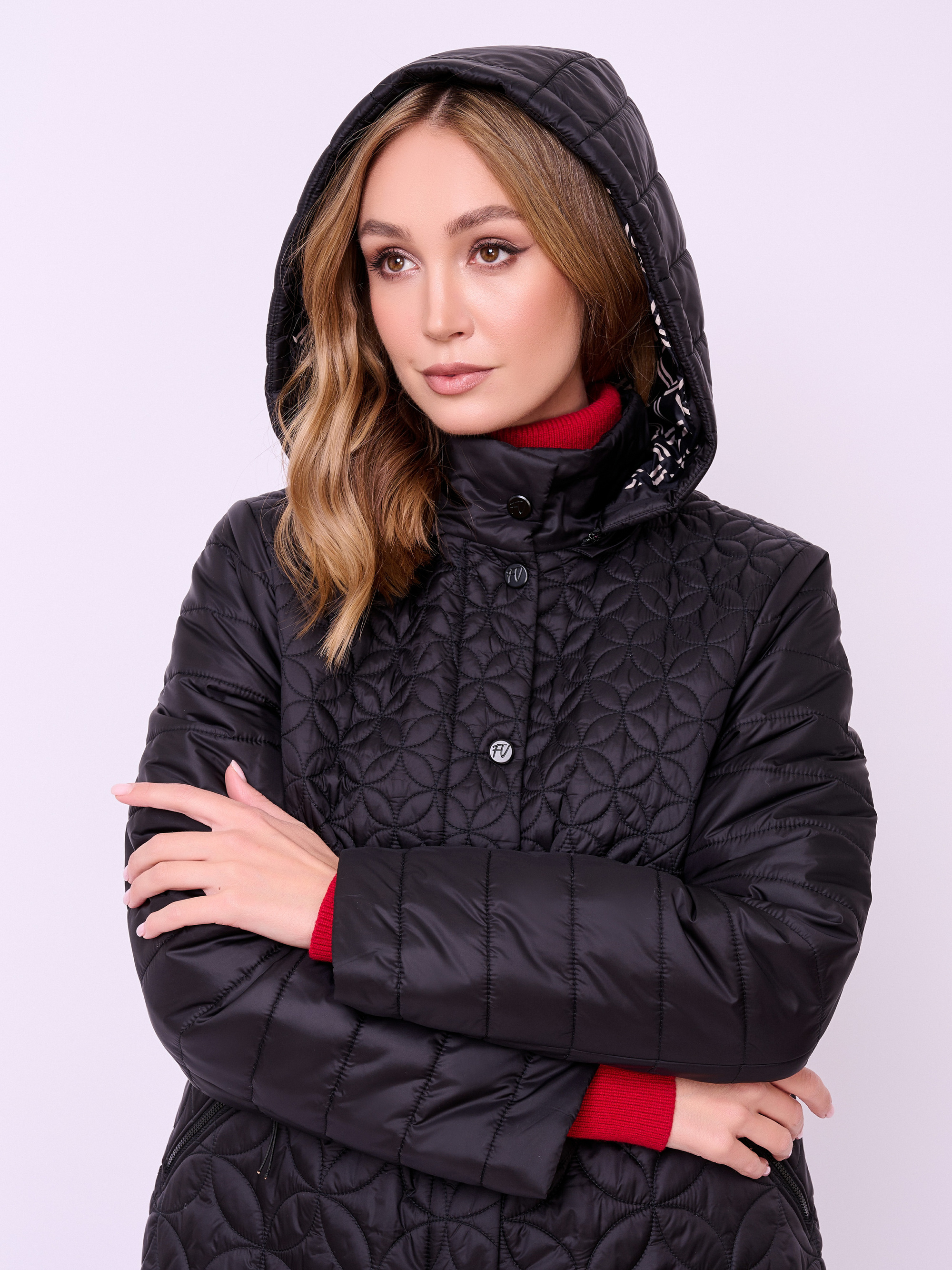 Утепленное стеганое пальто средней длины на молнии со съемным капюшоном, длинными рукавами и прорезными карманами на молнии. Длина по спинке: 90 см. Плотность утеплителя: 100