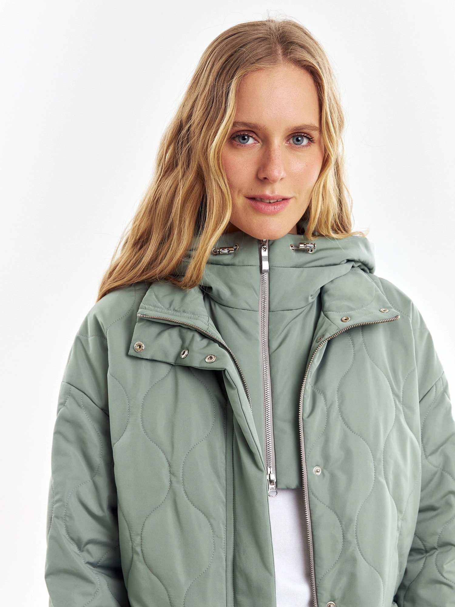 Короткая весенняя куртка из стеганой плащевой ткани в ультрамодном цвете "зеленый айсберг". Куртка имеет прямой силуэт, комфортный рубашечный рукав и высокий воротник-стойку. По бокам располагаются глубокие накладные карманы с клапанами. Застегивается изделие на молнию и установочные кнопки. В комплекте с курткой предлагается съемный капюшон с короткой манишкой. Капюшон, а также карманы и планка куртки выполнены из плащевой ткани-компаньона в цвете основной.