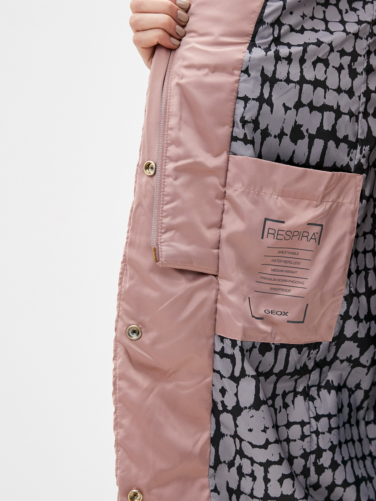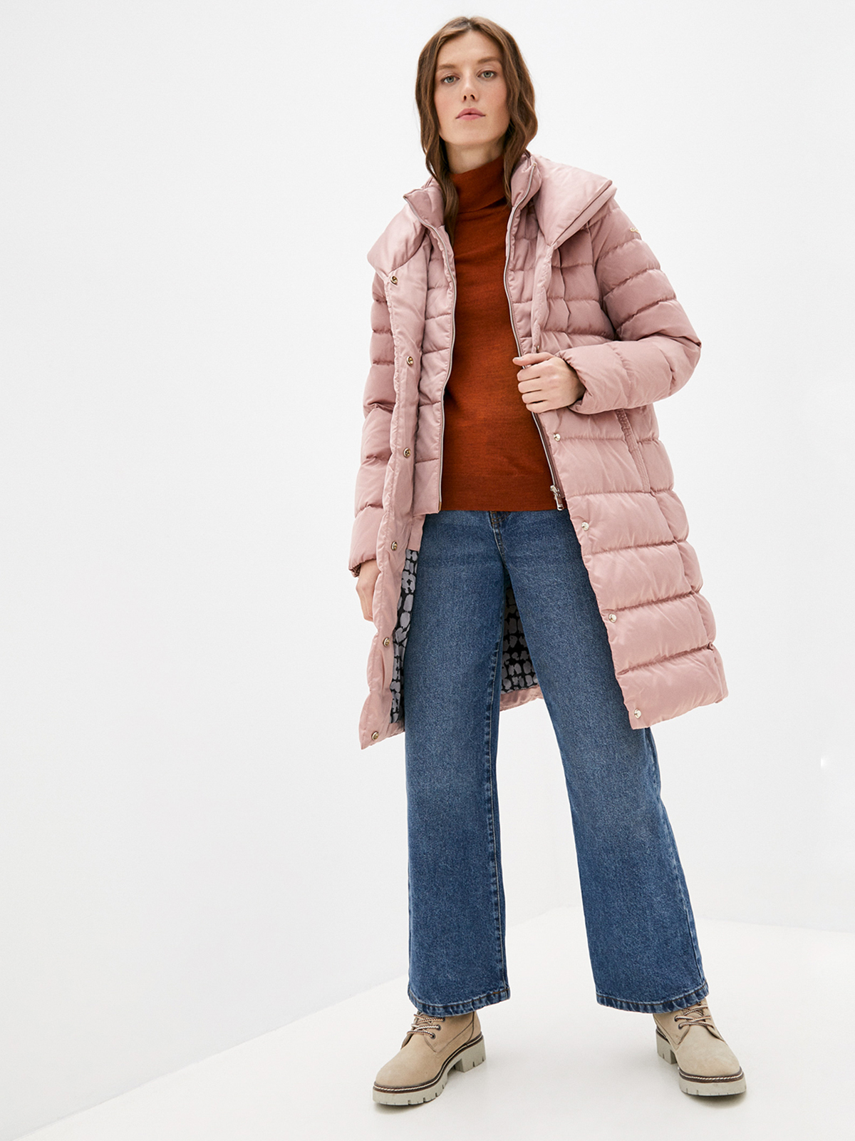 Однотонные зимнее пальто в пыльно-розовой расцветке. Натуральный пуховый наполнитель с добавлением пера. Застежка на молнию, ветрозащитная планка. Воротник стойка. Два боковых кармана с листочкой, плюс внутренний карман.