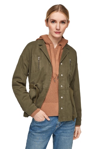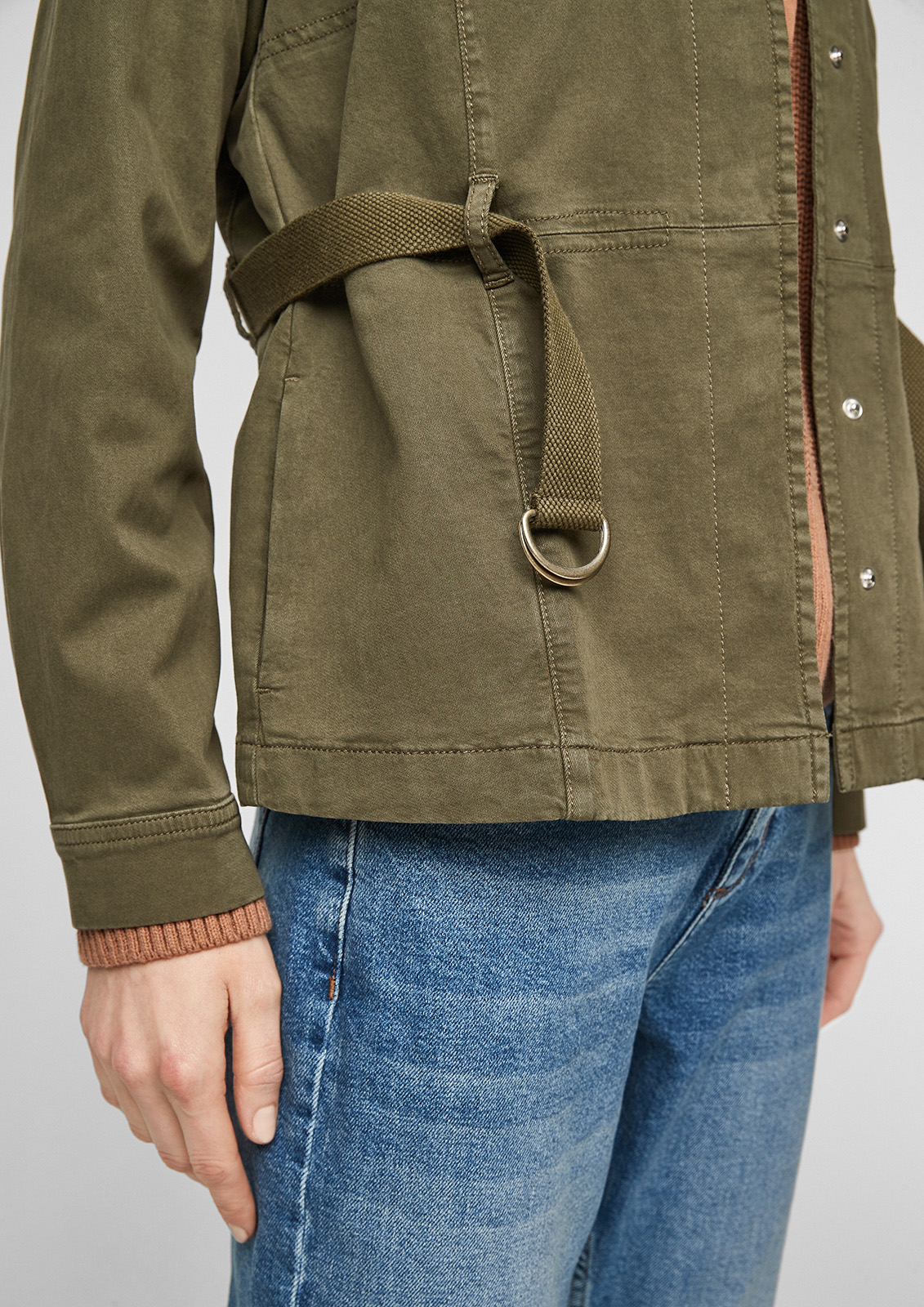 Куртка цвета хаки завершит стильный городской образ. Отложной пиджачный воротник, застежка на клепки. Накладные карманы на молнии на груди. В комплекте идет пояс из основной ткани куртки.