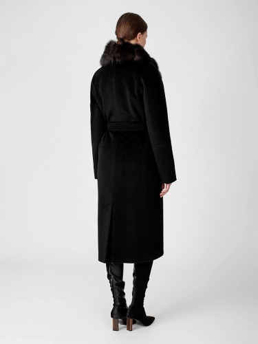 Пальто прилегающего силуэта из шерстяной ворсовой ткани чёрного цвета со съёмным воротником из натурального песца в росшив. Длина ниже колена. Рукава-кимоно с подрезом по низу, застёжка на пришивные кнопки, карманы в рельефах, английский воротник, пояс, шлица в среднем шве спинки. Произведено с ветрозащитной мембраной Raft Pro. Утеплитель DuPont Sorona из биопуха.