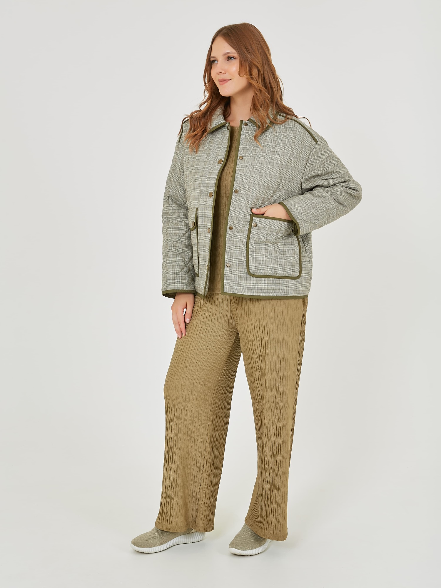 Куртка имеет стильный клетчатый узор в зеленых и серых тонах, что добавляет ей современный вид. Оформление с контрастной отделкой, застежками на кнопках и карманами придает ей функциональность и уют. Коллекция Весна-Лето 2025. Капсула "Марракеш". Параметры модели: 95-64-101, рост 175, размер 44-46