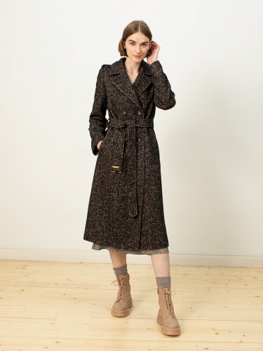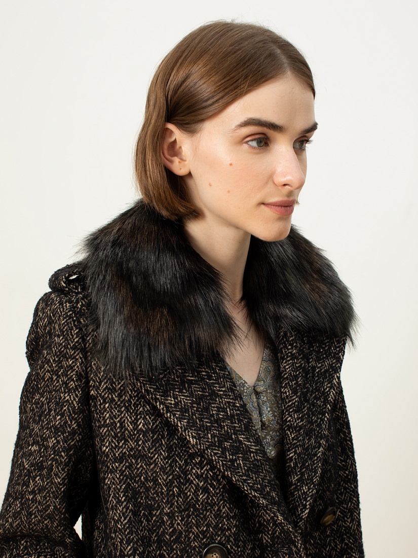 Двубортное пальто полуприлегающего силуэта из шерстяного твида со съемным воротником из искусственного енота. Втачной рукав, застёжка на роговые пуговицы, карманы с клапанами, пояс, шлица, погоны. Изделие декорировано широкой отделочной строчкой.