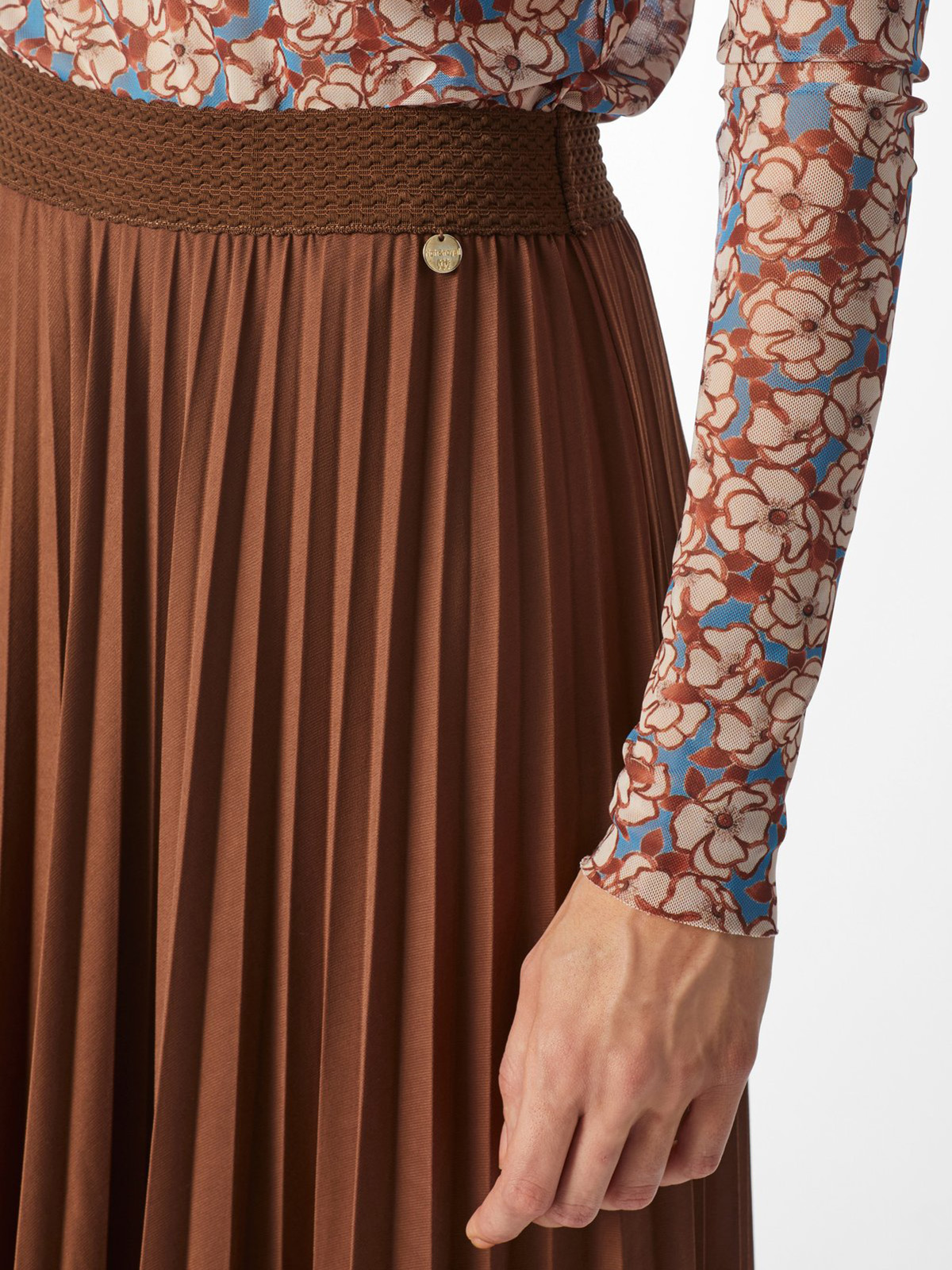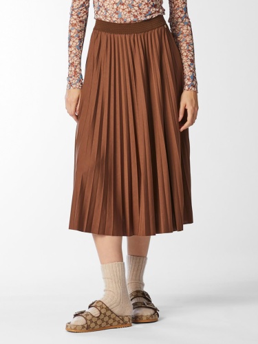 Плиссированная юбка длины миди в базовом коричневом оттенке. Эластичный пояс обеспечивает комфортную посадку по естественной линии талии. Юбка хорошо сочетается с разной обувью как в классическом, так и в спортивном стиле.