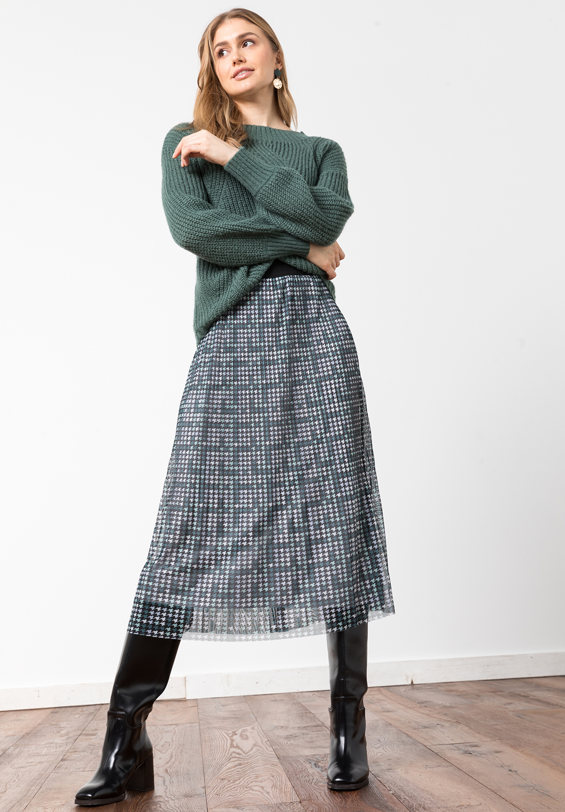 Двуслойная юбка в геометрическом узоре по всей поверхности изделия выполнена из полупрозрачного материала. Длина миди, комфортная посадка по естественной линии талии. Эластичный пояс обеспечивает комфортное ношение.