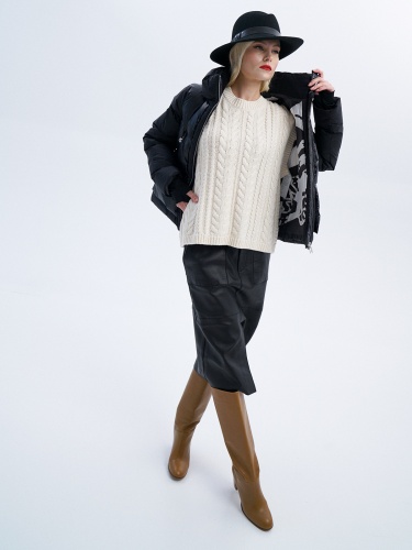 Юбка из натуральной кожи прямого кроя с рельефами. Застежка спереди на молнию и пуговицу. Накладные карманы и разрез спереди.