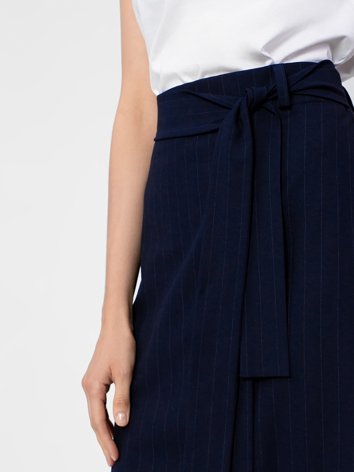 Юбка из костюмной ткани в полоску силуэта трапеция на притачном поясе со шлевками. Спереди декоративный запах треугольной формы. Сзади пояс на резинке. В комплект входит широкий съемный пояс из основной ткани.
