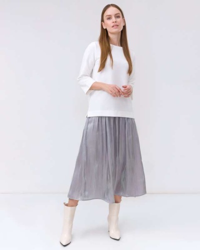 Юбка миди универсального А-силуэта подойдет как для повседневного, так и для праздничного образа. Выполнена из ткани с металлическим отливом. Материал подкладки – вискоза с добавлением эластана. Эластичный пояс обеспечивает комфортную посадку и удобство ношения.
