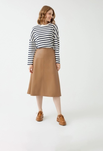 На сайте указаны Российские размеры Юбка силуэта трапеция из экокожи карамельного цвета длины миди. В боковых швах два функциональных прорезных кармана. В качестве декоративных элементов - вертикальная и горизонтальная отстрочки. Юбка послужит отличной осенней базовой вещью, которая добавит модный акцент в любой образ. Рост модели на фото - 175 см.