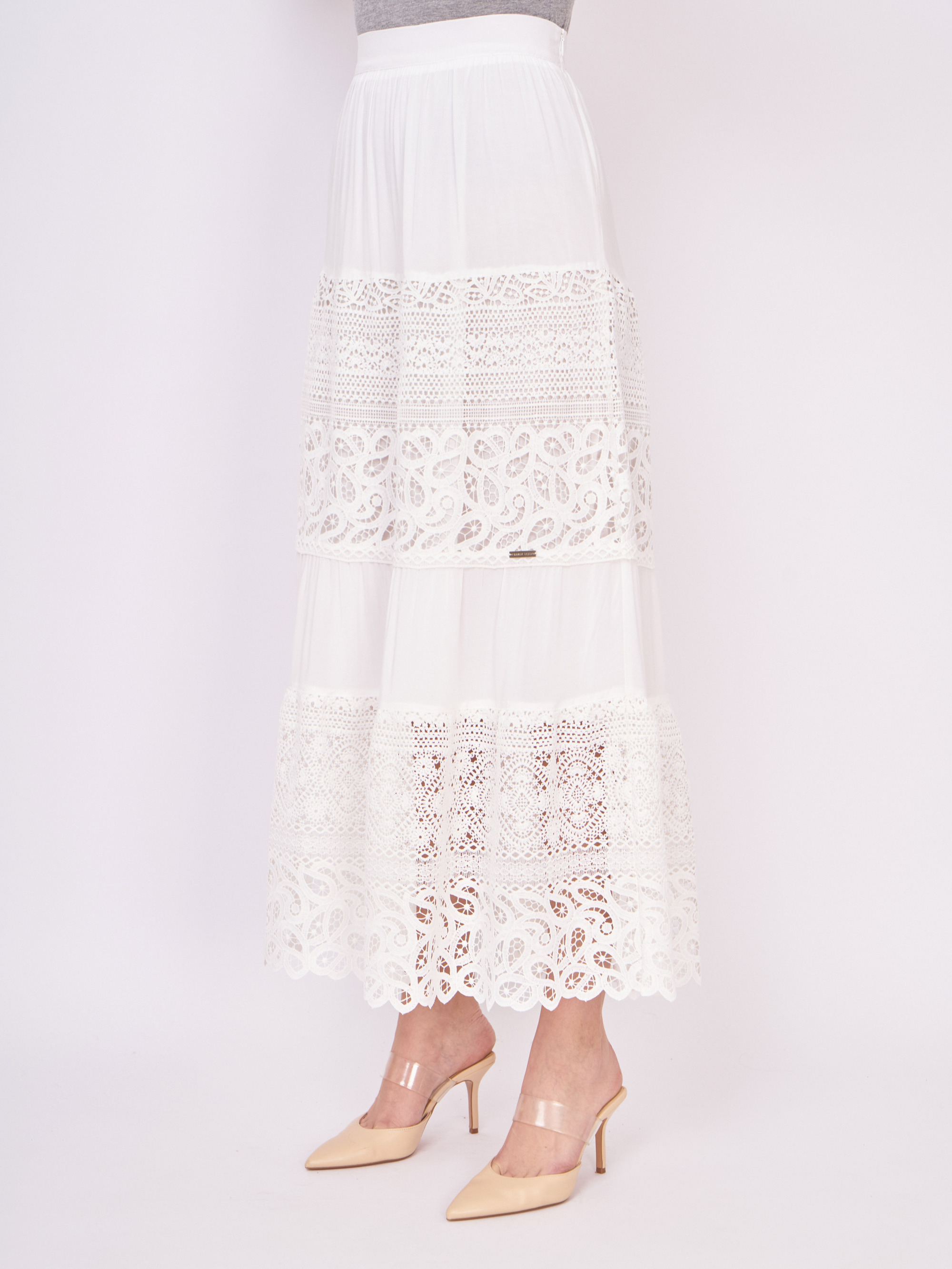 На сайте указаны российские размеры. Текстильная белая макси юбка трапеция на молнии, с кружевными вставками, с воланами. Длина юбки: 97 см. Рост модели: 177 см.