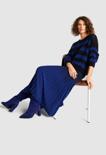 Юбка длиной до щиколотки подчеркивается складками, которые в сочетании с эффектом омбре создают чрезвычайно тонкую игру цветов.