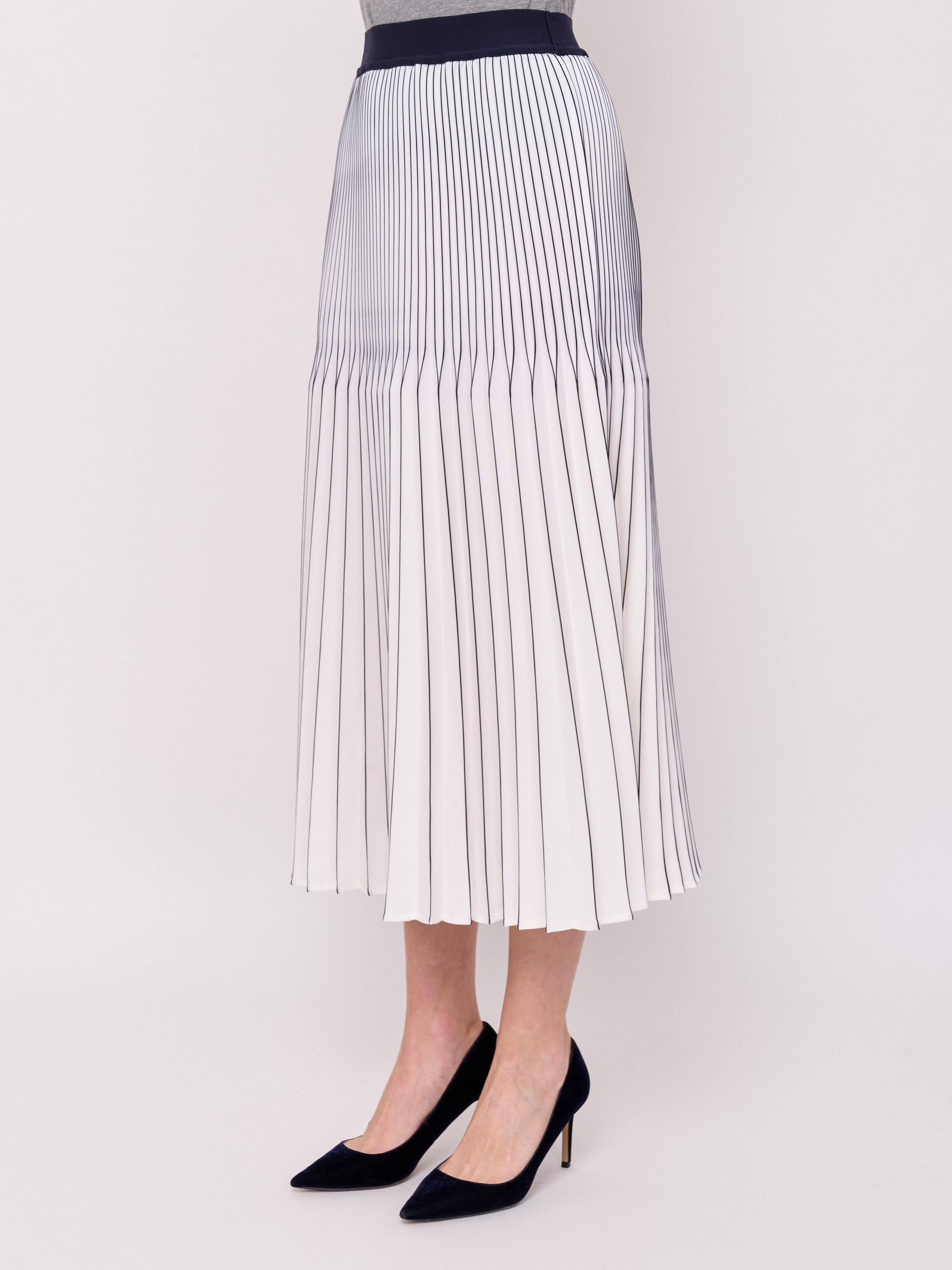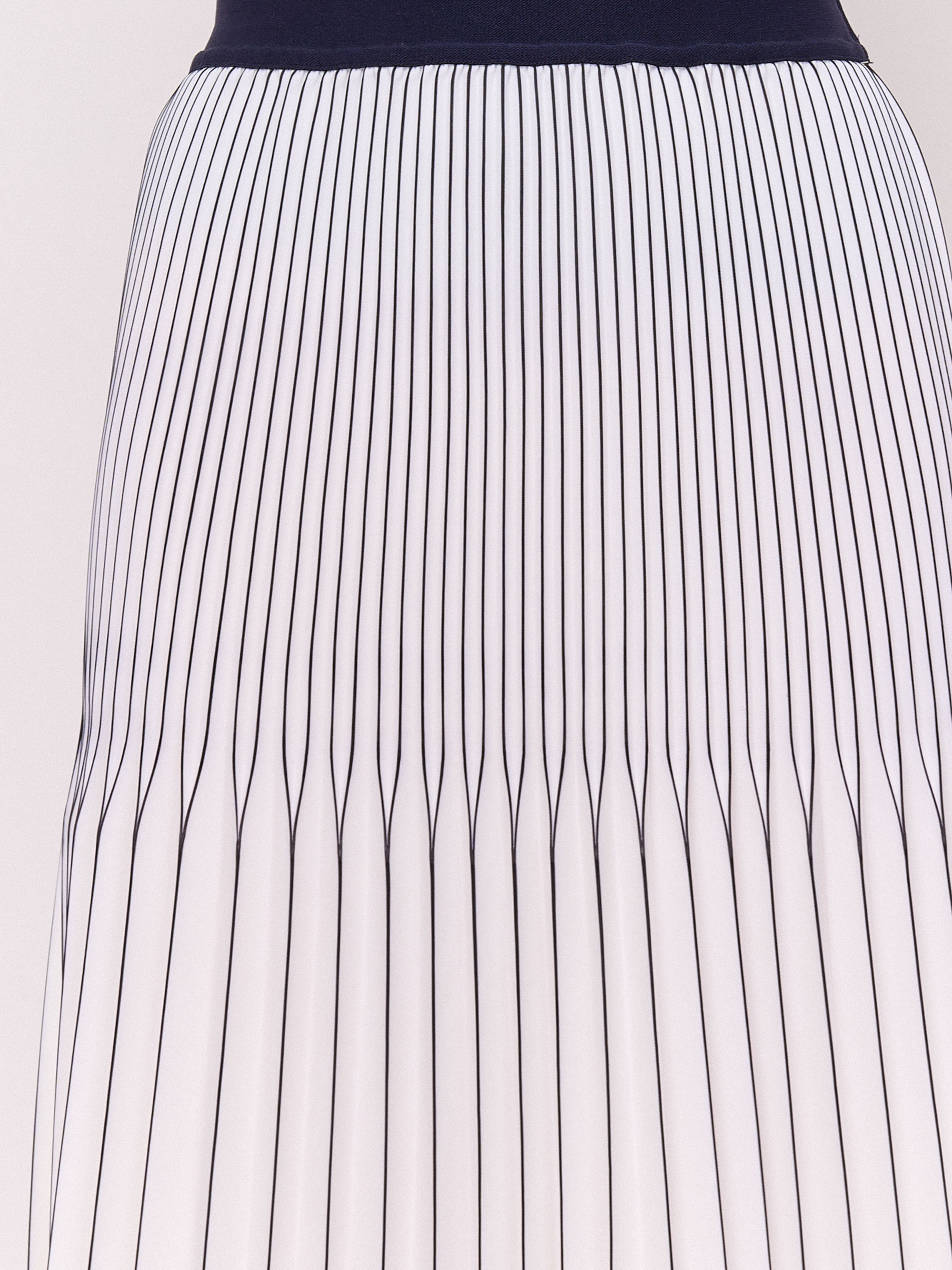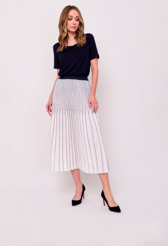 Детали: без застежки, покрой расклешенный, посадка средняя, рисунок полоска, без карманов, конструктивные элементы гофре, модель юбки гофрированная, длина юбки миди. Длина по спинке: 83 см.