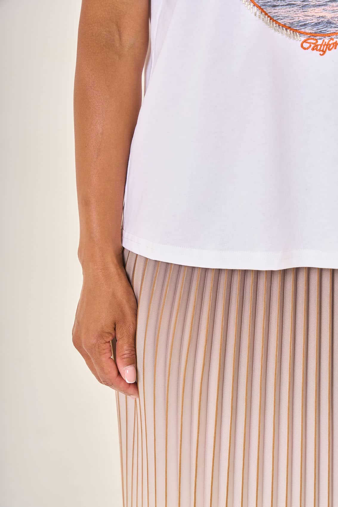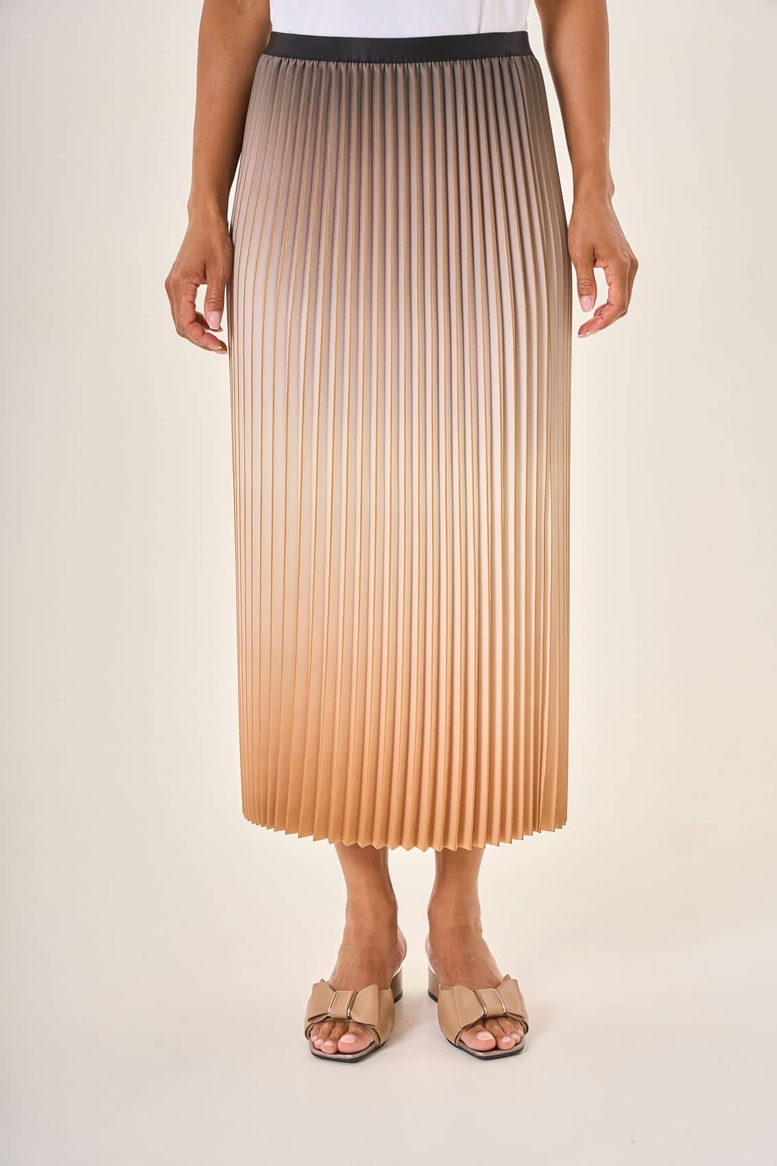 Плиссированная юбка средней длины с плавным градиентом,перетекающим от благородного серо-коричневого к роскошному золотистому оттенку. Завершающий штрих образа — контрастный чёрный пояс, подчёркивающий талию и добавляющий динамики силуэту.