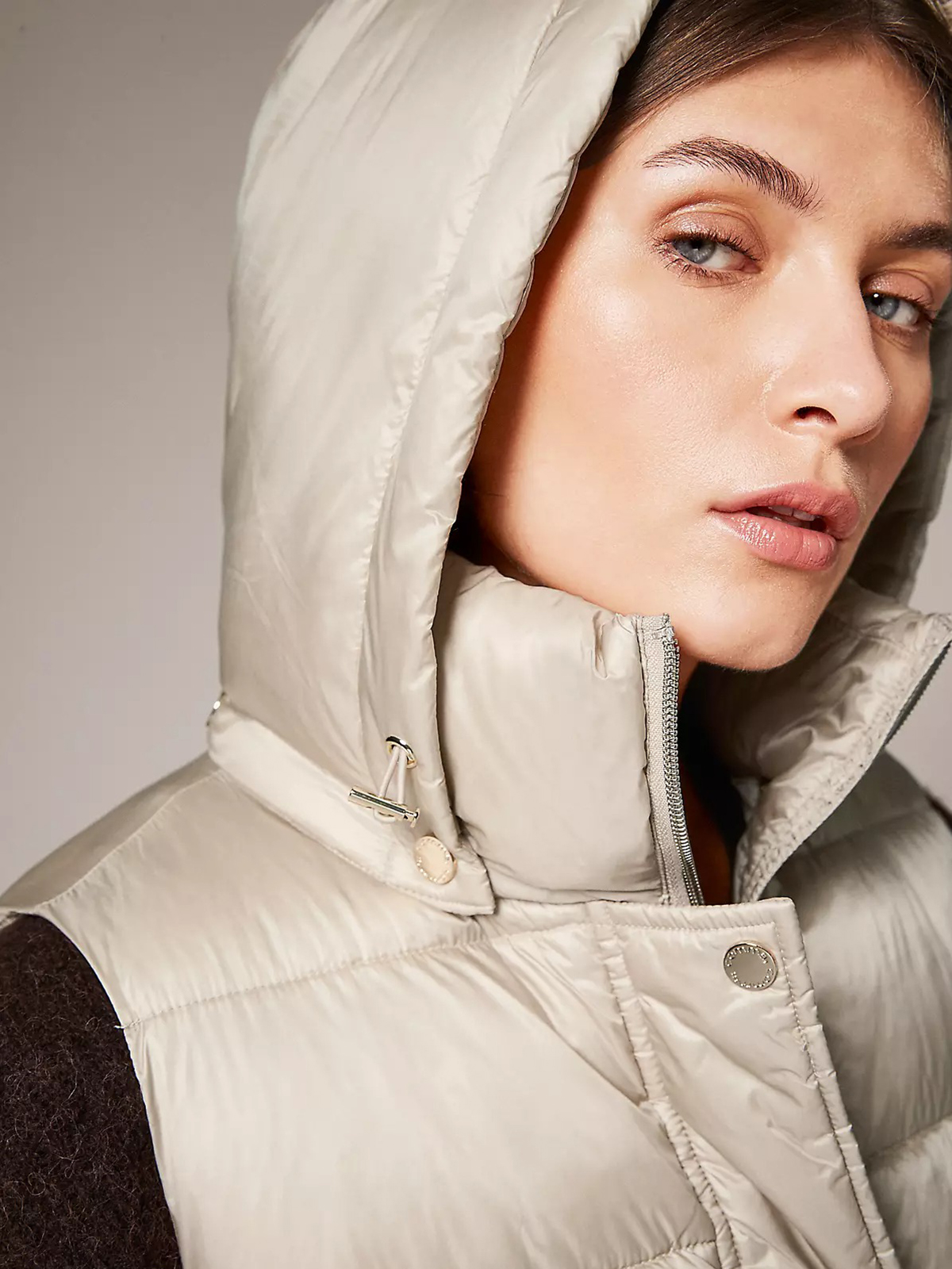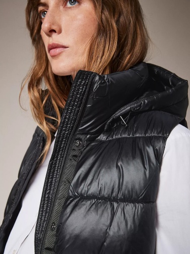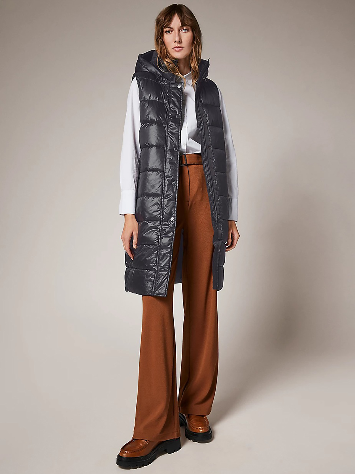 Удлиненный стеганый жилет базового оттенка – теплый и стильный элемент аутфита. Подойдет для образов в спортивном или повседневном стиле, а также для образов спорт-шик. Застежка на молнию и клепки. Объемный капюшон защищает от ветра.