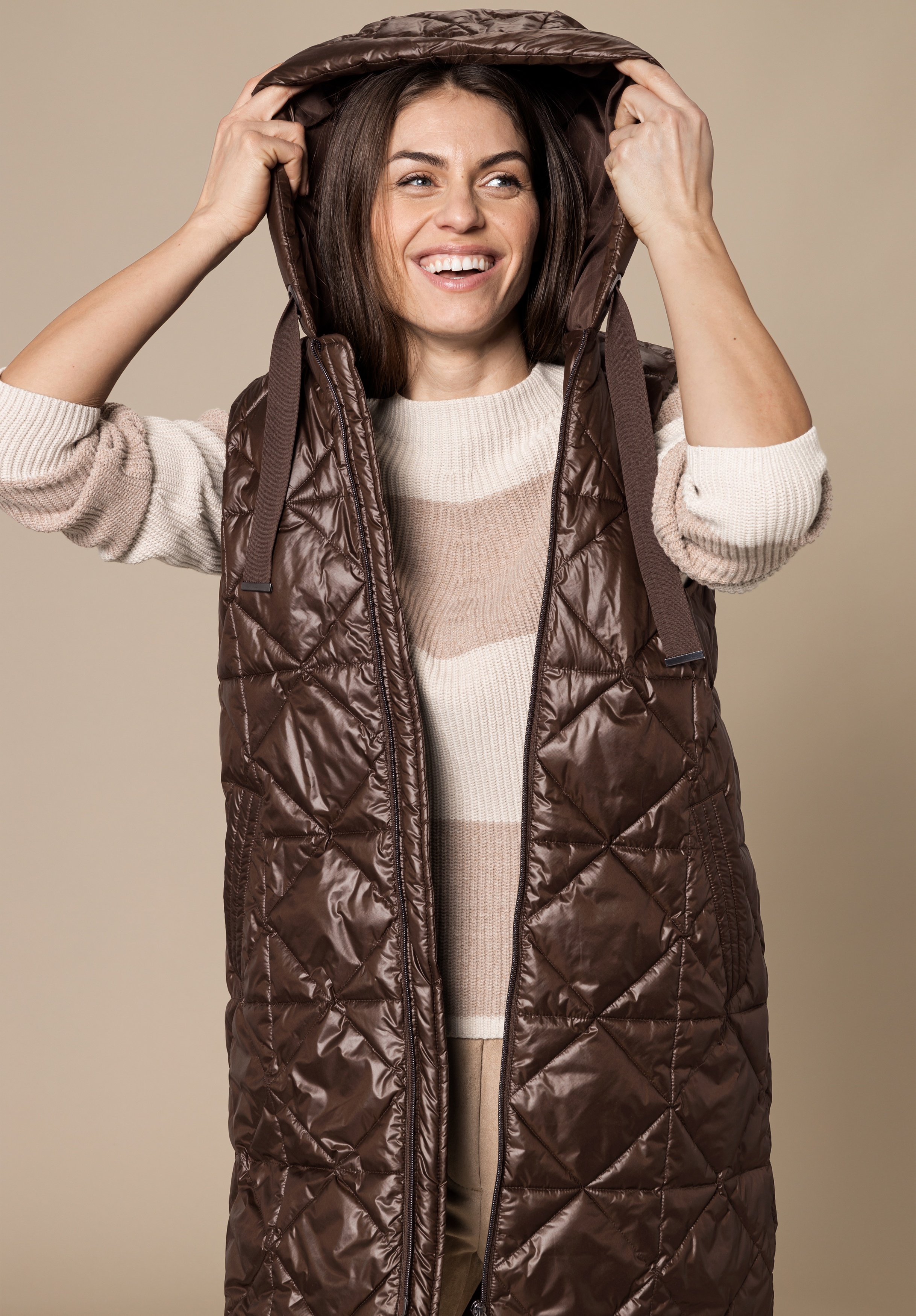 На сайте указаны российские размеры. Длинный стеганый жилет со слегка блестящим эффектом. Полиэстер высокого качества. Боковые карманы, капюшон с кулиской, двусторонняя молния. Прямой крой и посадка, без талии. Длина жилета - 97 см.