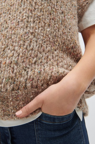На сайте указаны российские размеры. Жилет из итальянской разноцветной твидовой пряжи с добавлением кашемира и шелка. Легкая открытая отделка идеально дополняет объемный силуэт с V-образным вырезом и заниженной линией плеч. Наша модель ростом 178 см.