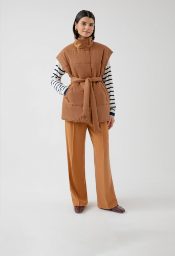 На сайте указаны российские размеры. Стеганый жилет в роскошном медовом цвете из плотной и мягкой плащевой ткани. Жилет выполнен на утеплителе, что сделает Ваш образ не только стильным, но и очень теплым. Воротник-стойка имеет комфортную посадку, которая не стеснит движений и при этом будет надежно защищать от ветра. В качестве дополнительного декоративного элемента в комплекте идет пояс, который сделает силуэт более женственным и утонченным. Для дополнительной защиты от ветра жилет выполнен с использованием мембраны RaftPro. Длина изделия 73 см. Рост модели 175 см.